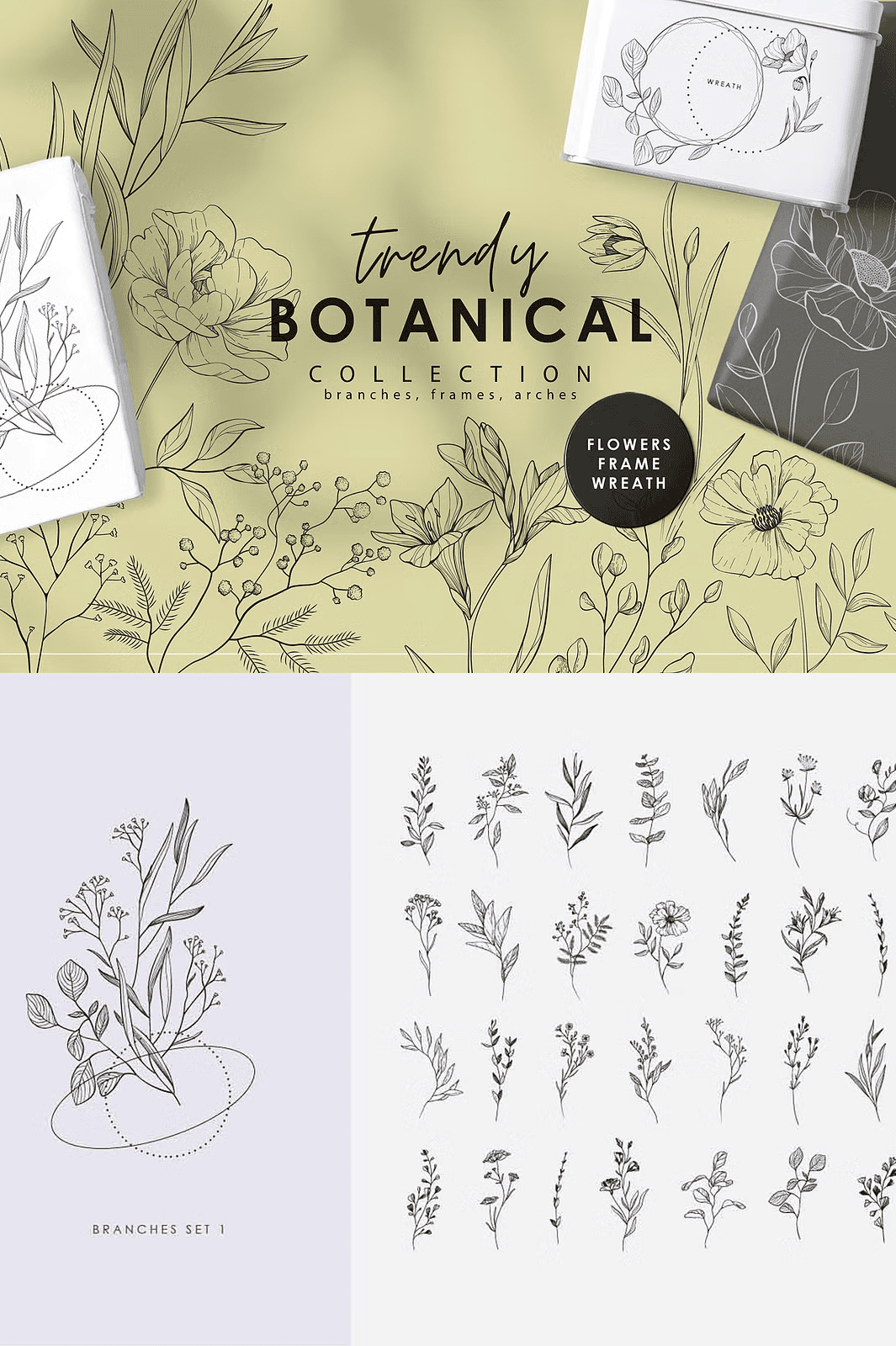 – **100+ unique line illustrations** including single floral branches, wildflower clusters, leafy stems, and abstract botanical motifs