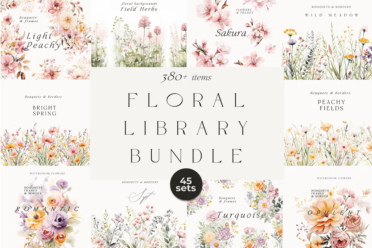 – **45 unique floral sets** – each containing 8 or more items (bouquets, borders, frames, wreaths, seamless repeats)