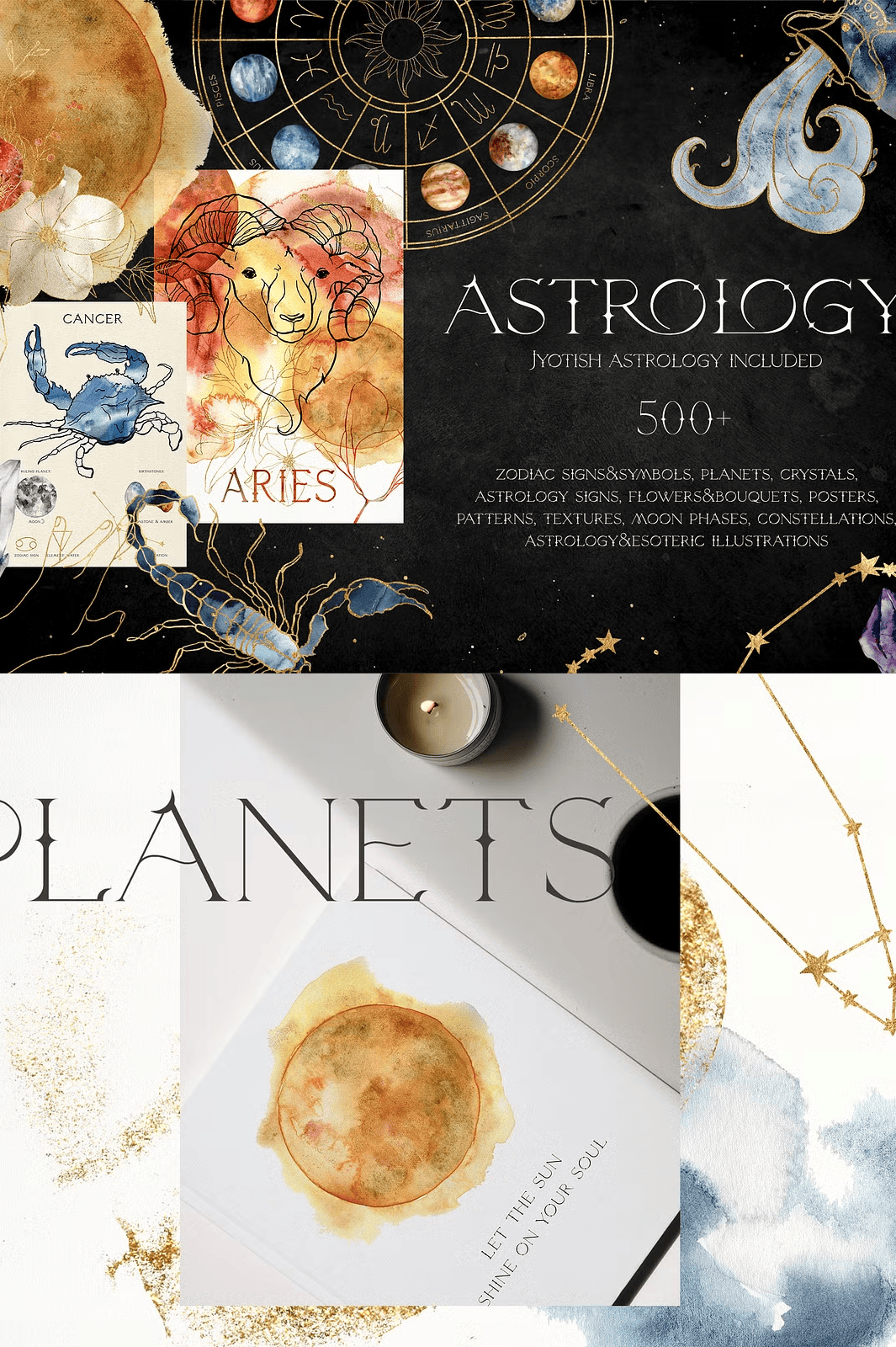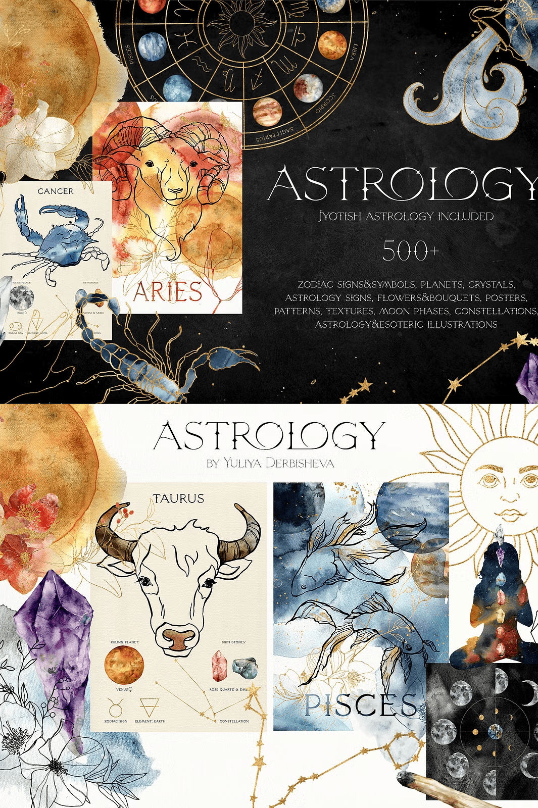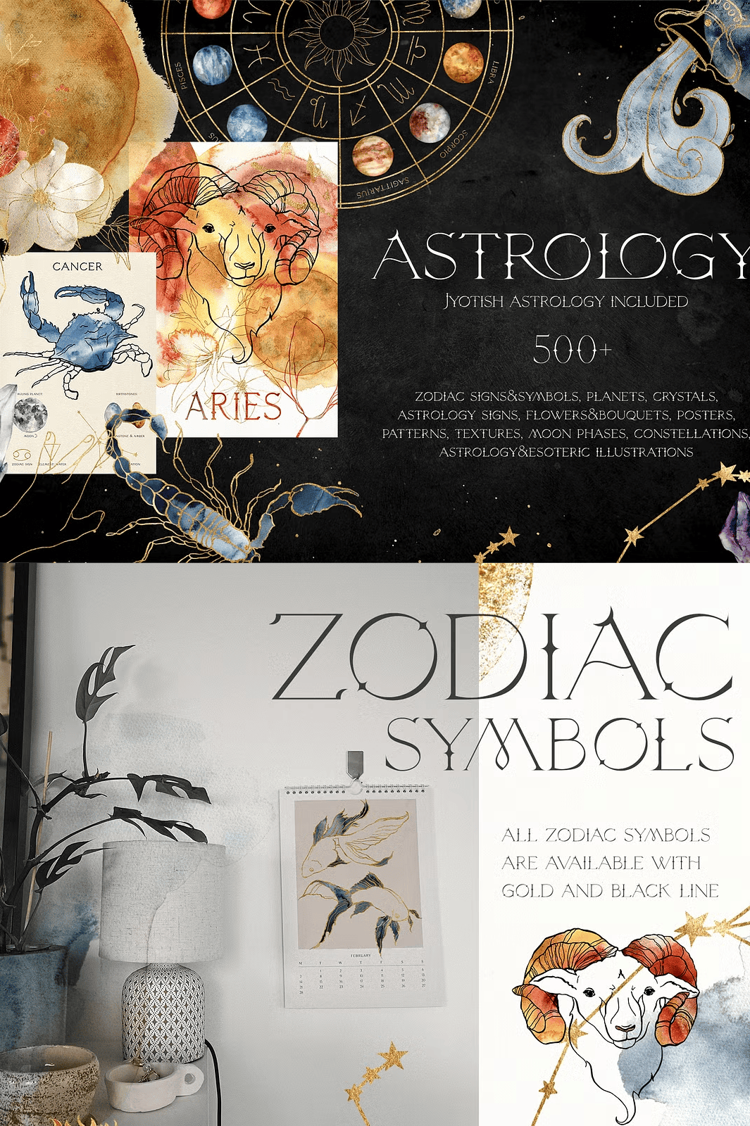 – **70 line art zodiac illustrations** (gold & black, PNG + EPS10 + PNG, transparent)