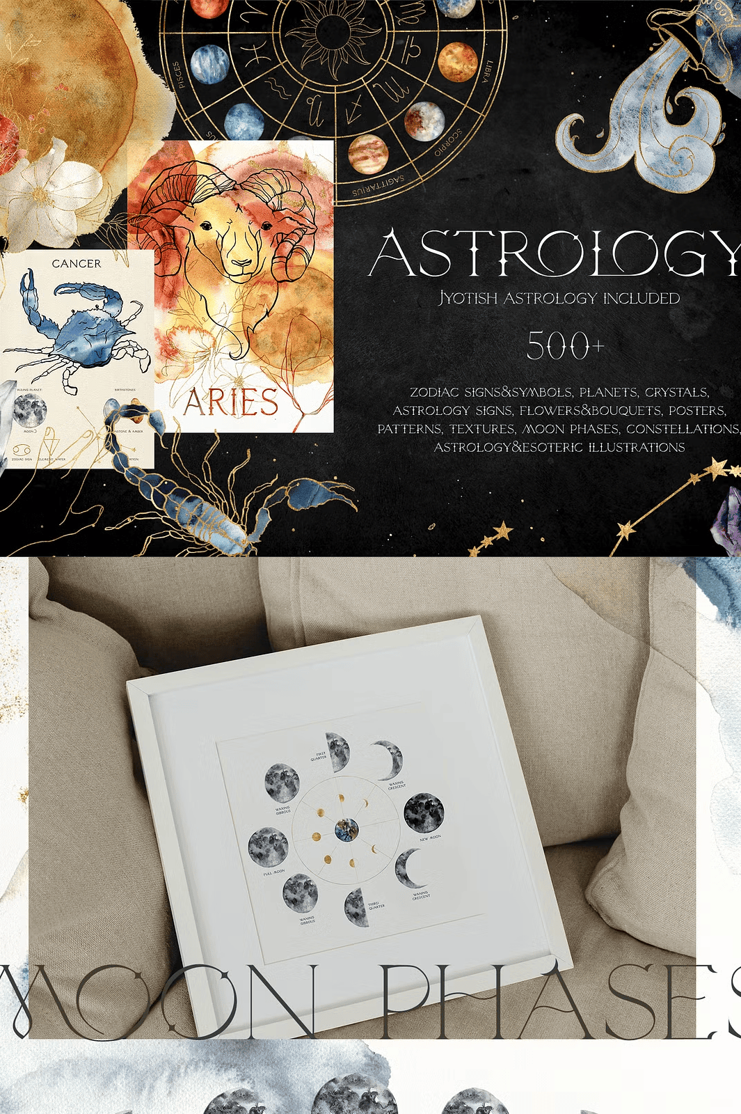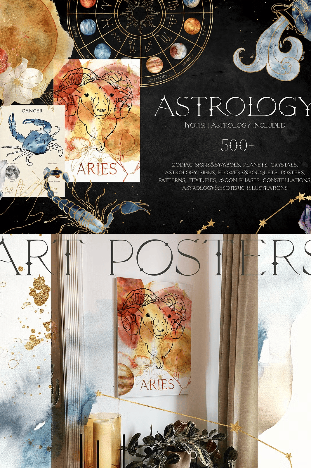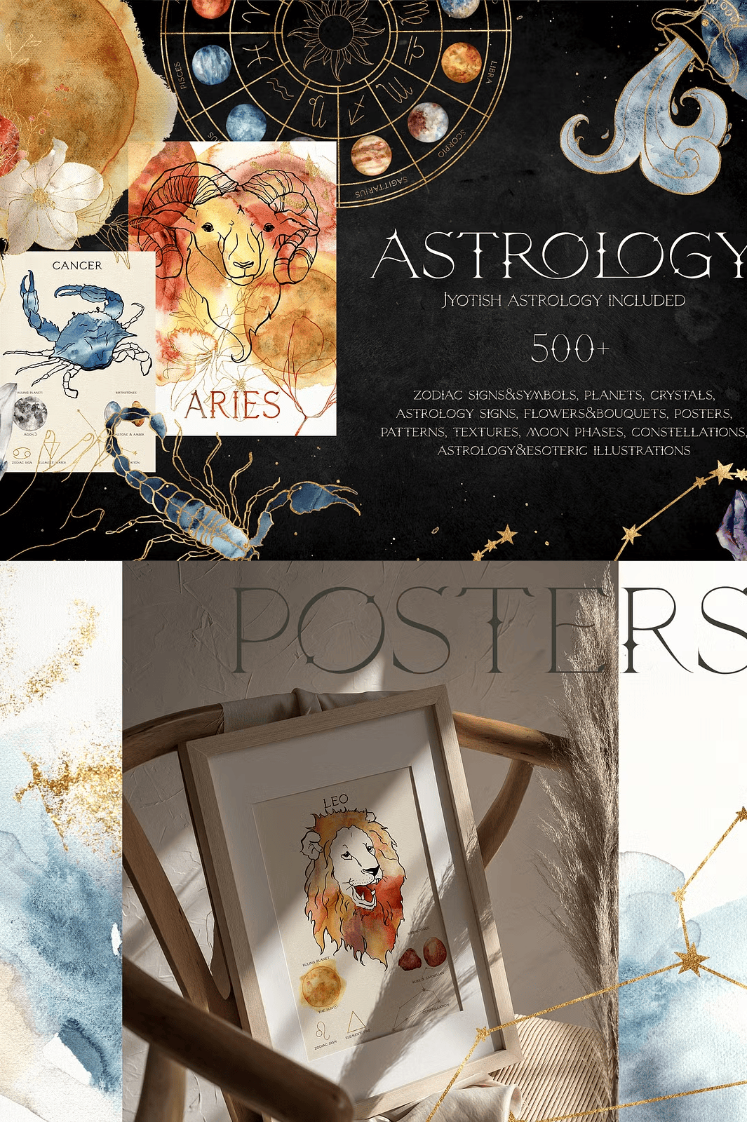 – **35 A3-format posters** with zodiac symbols in JPG (beige background) and PNG (transparent background) at 3508×4961 px