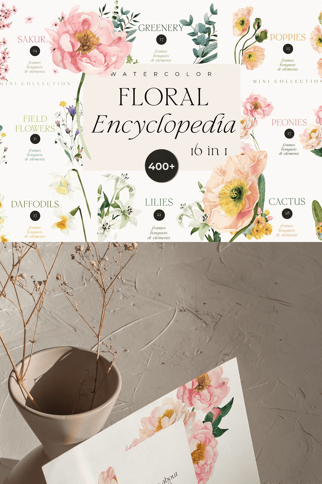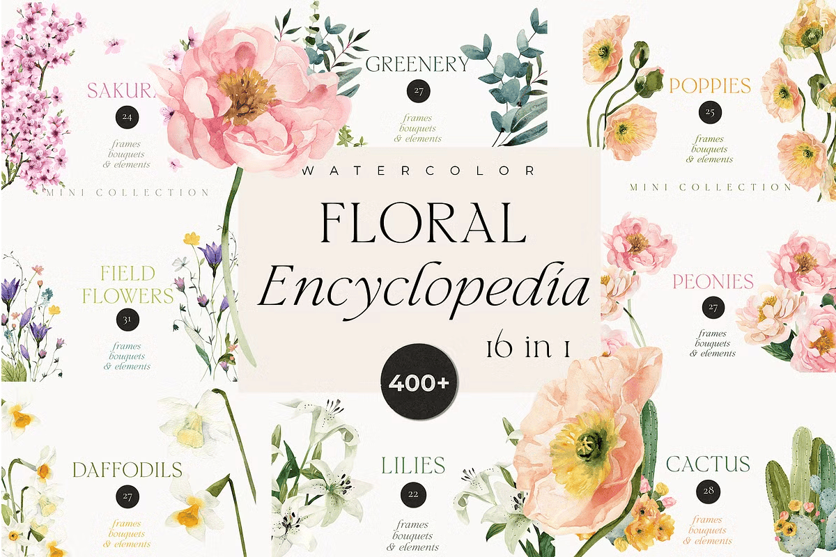 Unlock the magic of nature with the **Floral Encyclopedia** — a meticulously curated collection of hand-painted watercolor illustrations designed for artists and creators who demand beauty, detail, and versatility. This comprehensive bundle brings you 16 distinct mini-collections packed with over 400 high-resolution digital graphics, all inspired by the most enchanting seasonal blooms and greenery. Every element is crafted with heartfelt care, scanned at high resolution, and cleaned to perfection to deliver crisp, professional-quality artwork.