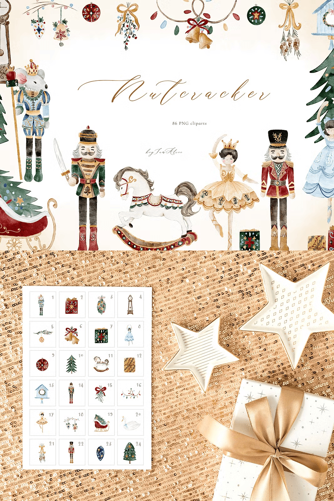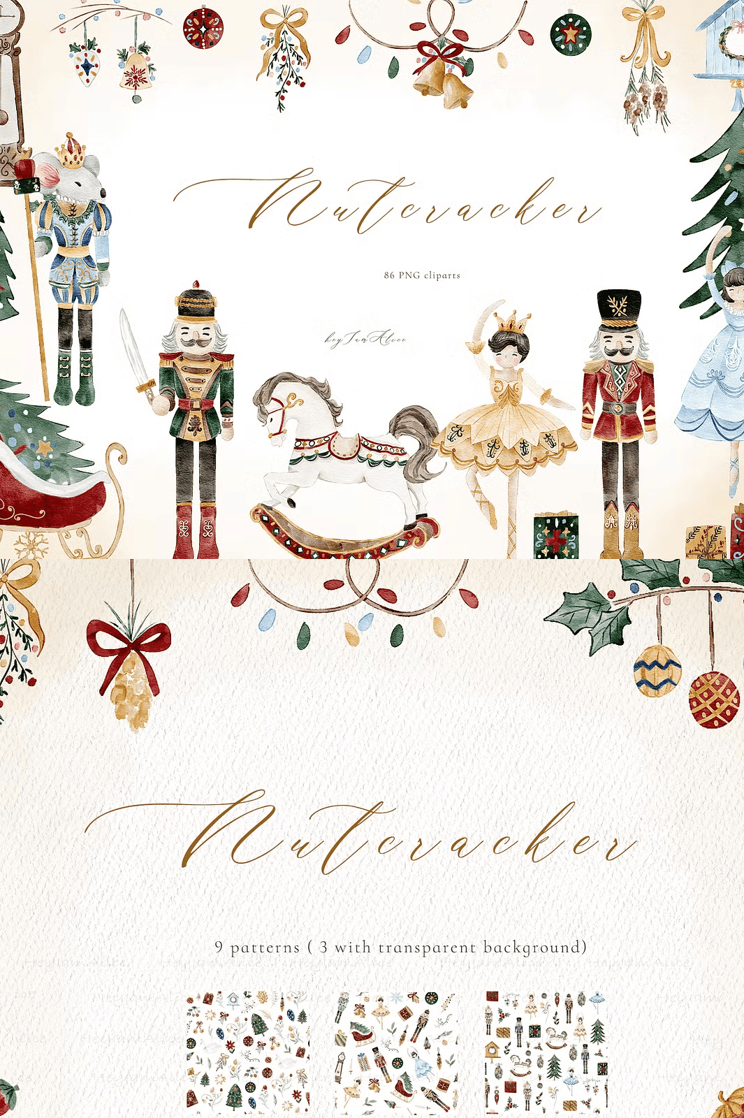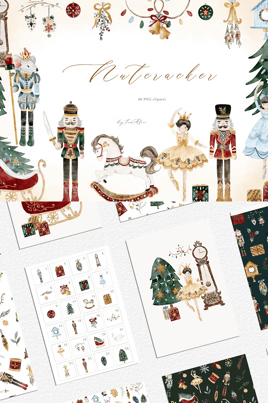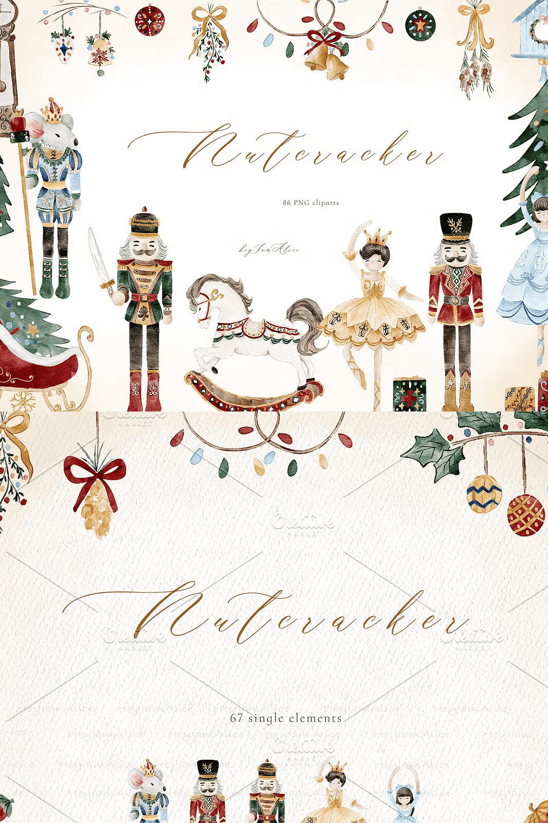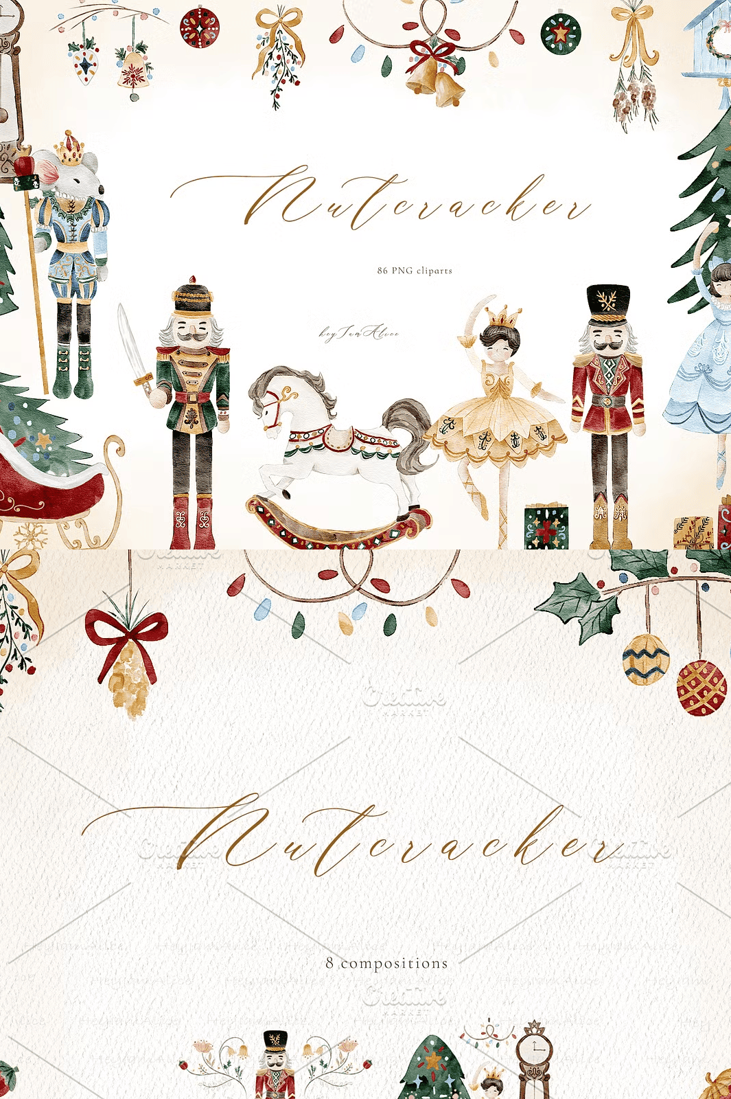 The Nutcracker Watercolor Elements are crafted to align perfectly with professional design needs and individual creativity. Utilize these versatile elements to: