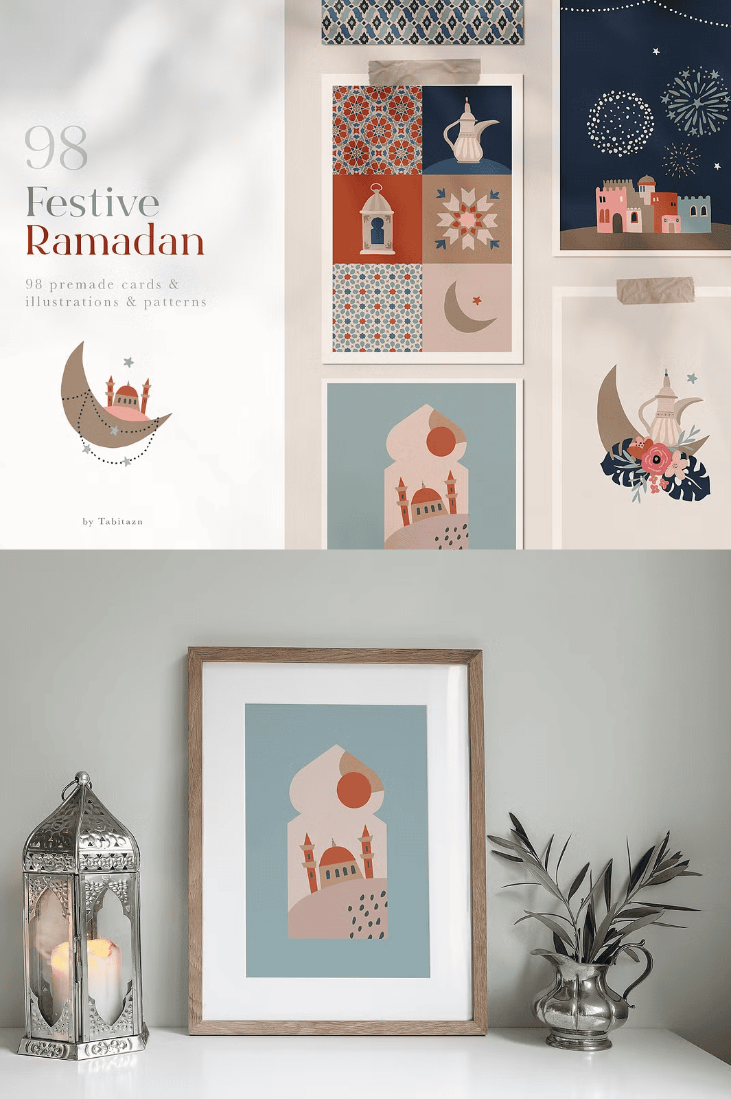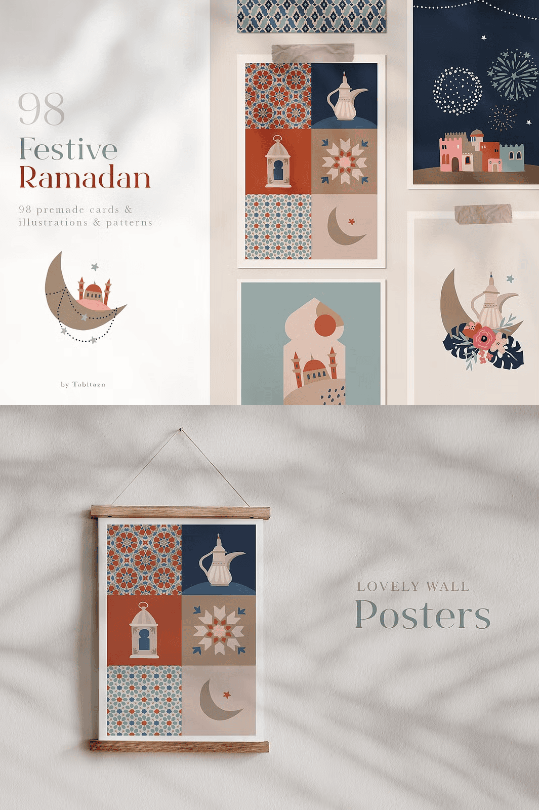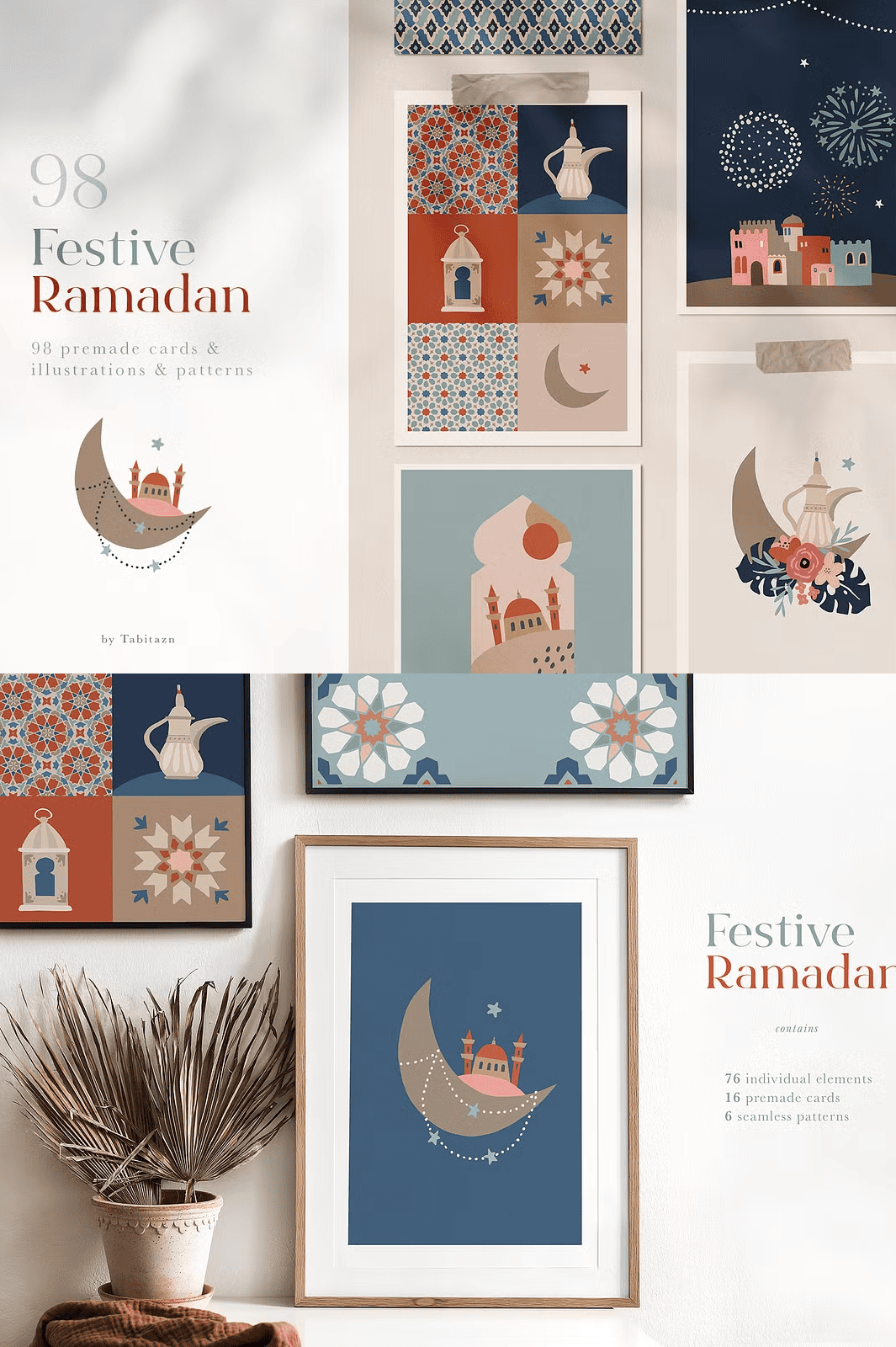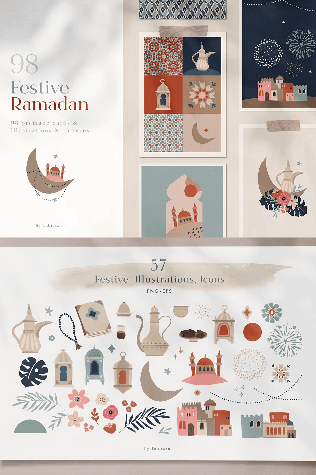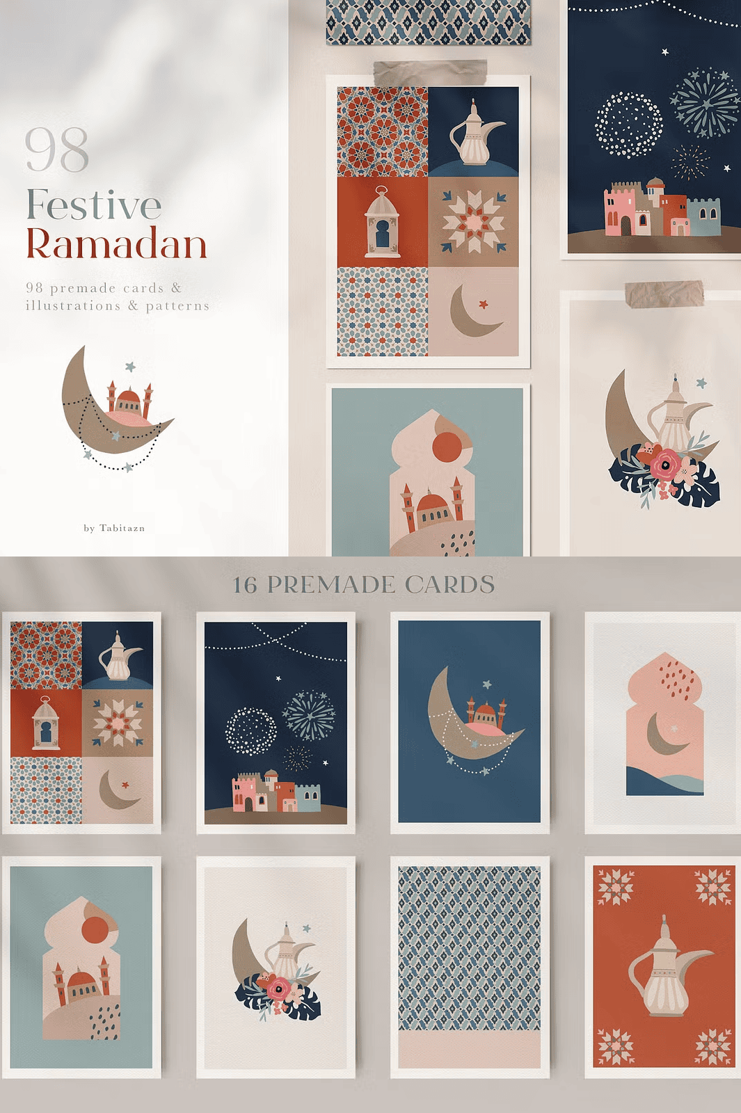 – **16 Pre-Made Greeting Cards**: Fully editable EPS files and high-res JPG files (3158 x 4500 px), designed with authentic cultural details for Ramadan and Eid messages.