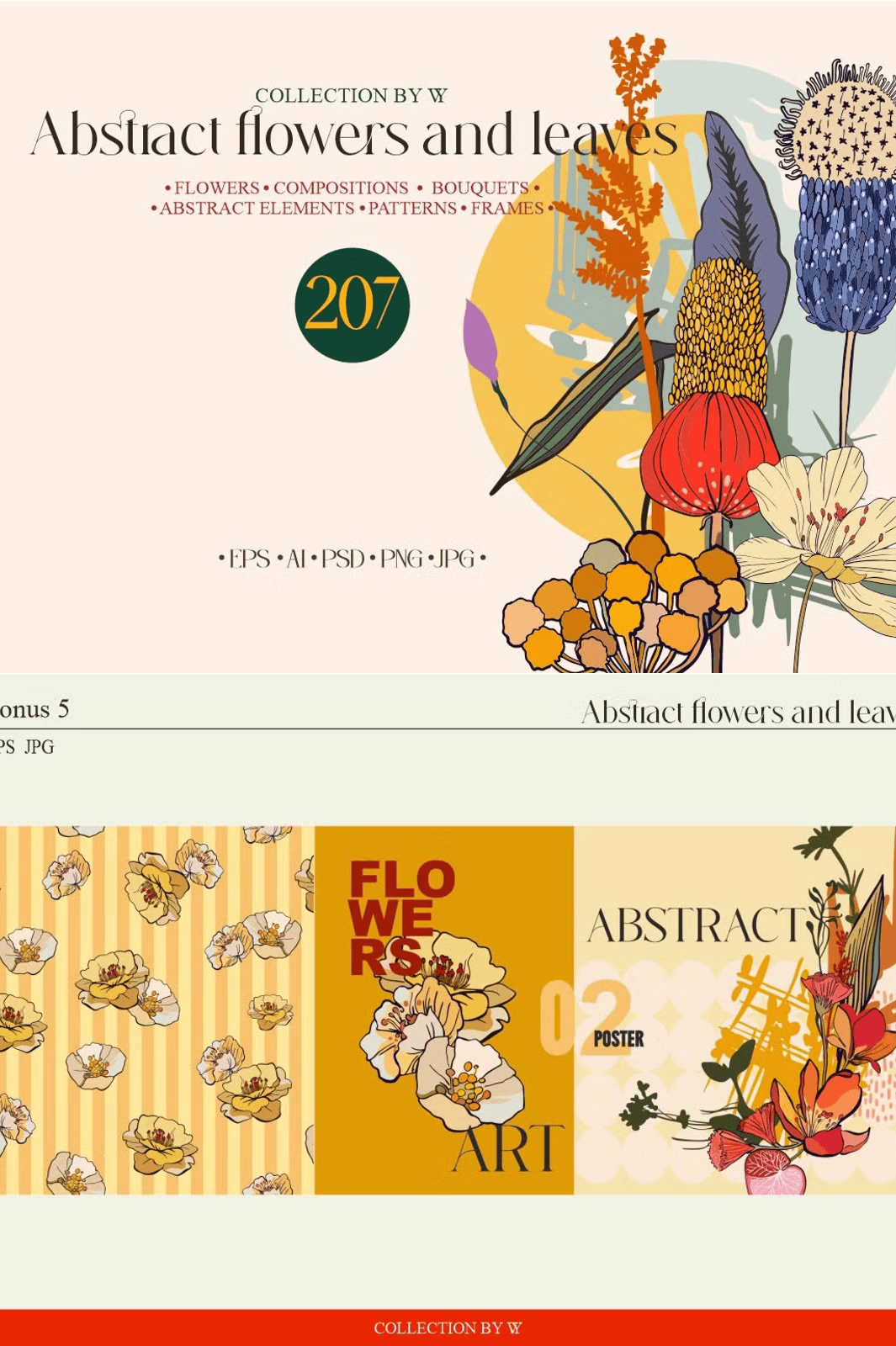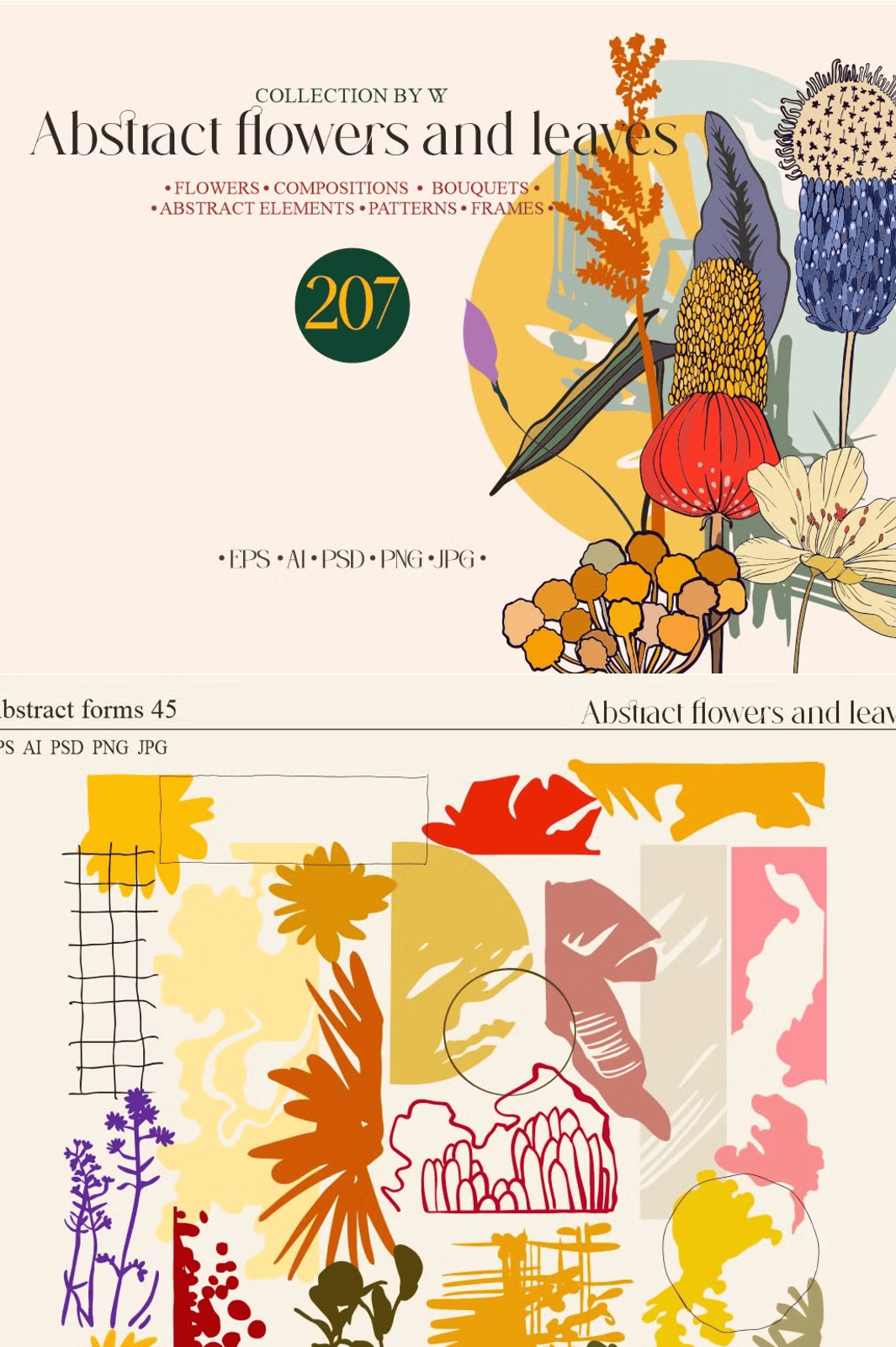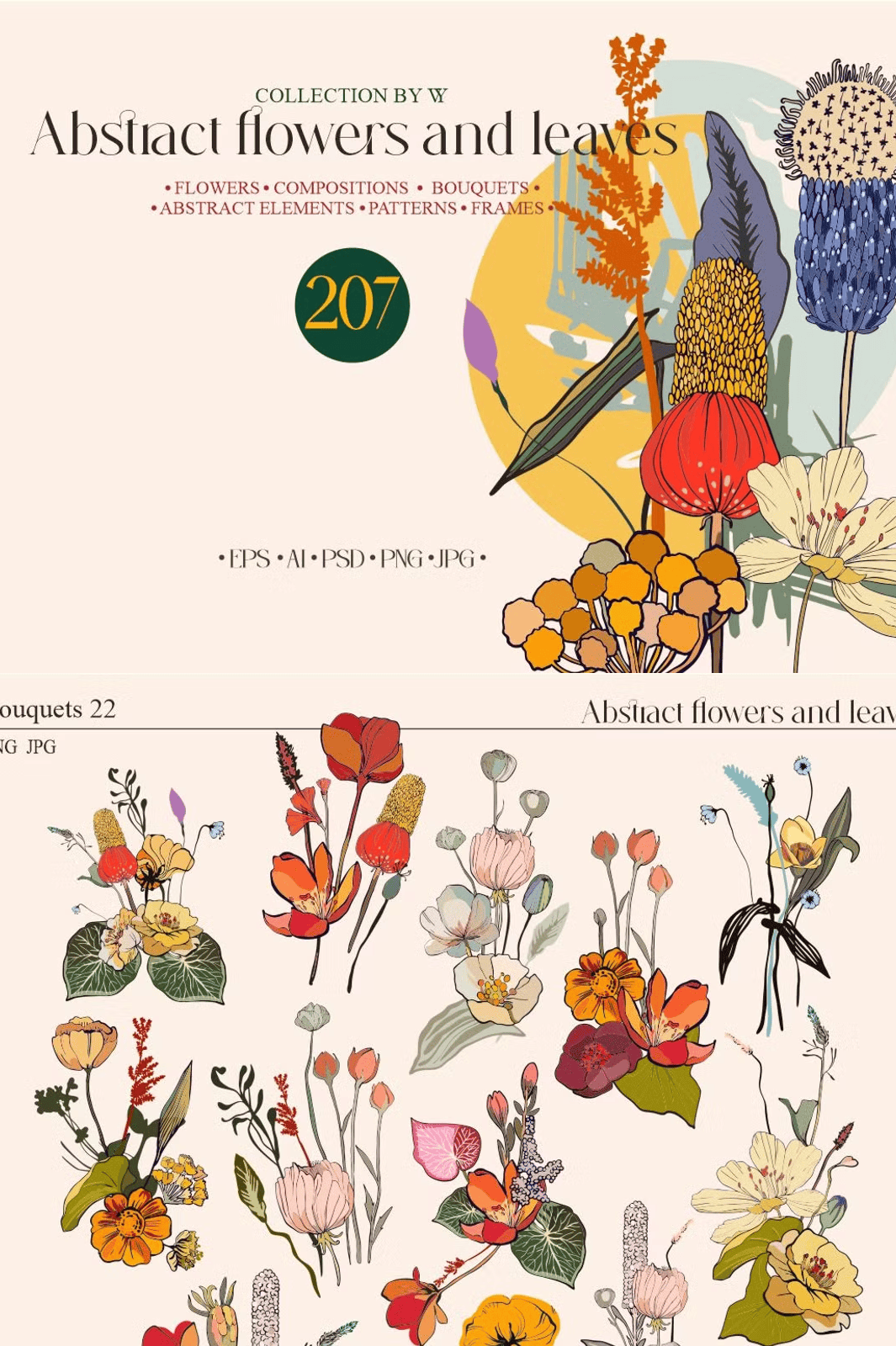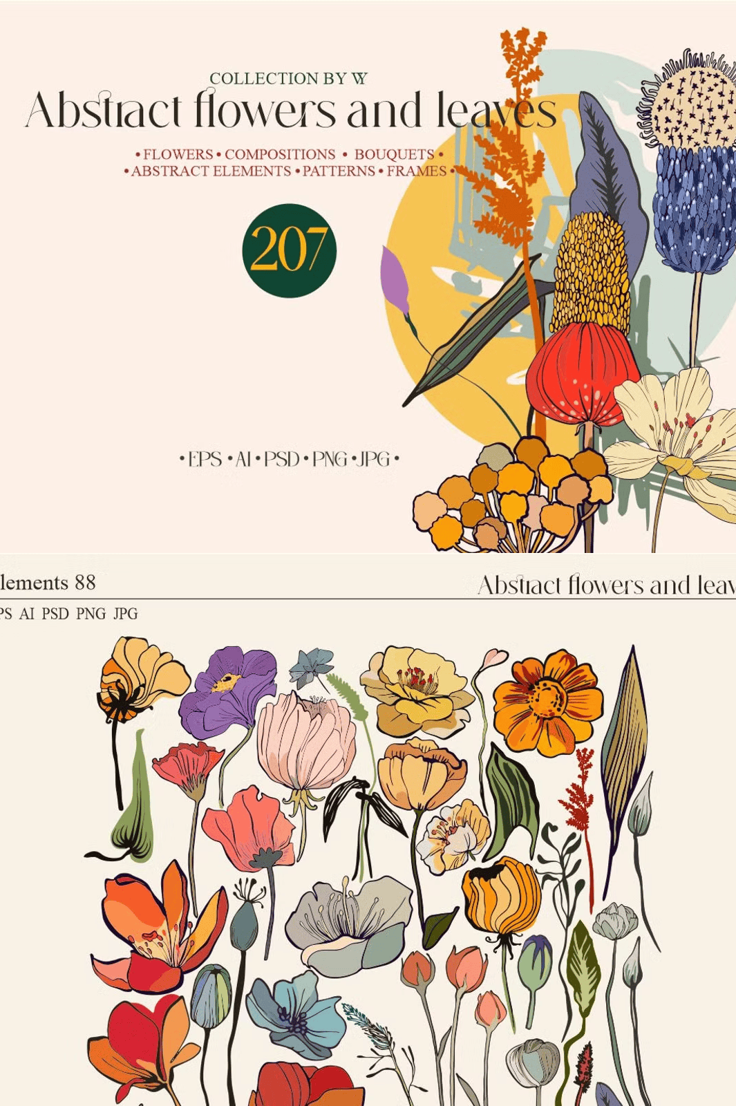– **88 Botanical Elements**: High-resolution EPS, AI, PSD, PNG, and JPG files of individual flowers, foliage, and stems—perfect for layered compositions and flexible editing.