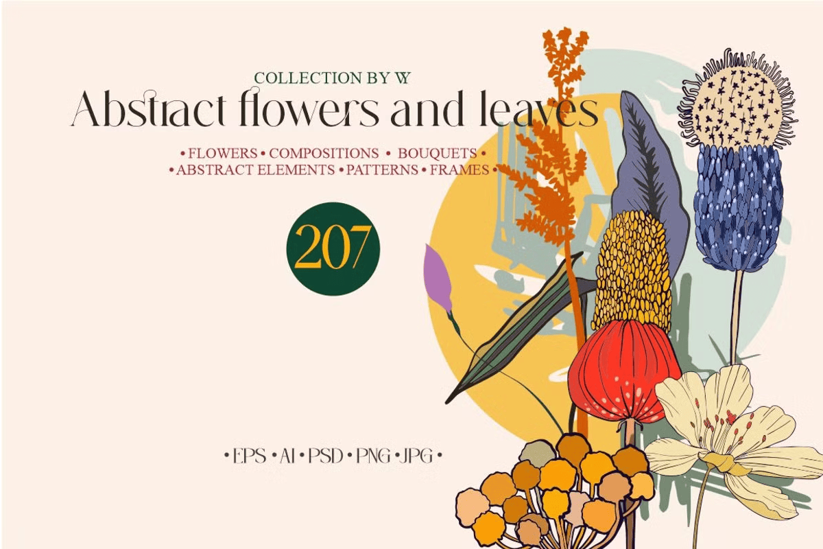 – **88 Botanical Elements**: High-resolution EPS, AI, PSD, PNG, and JPG files of individual flowers, foliage, and stems—perfect for layered compositions and flexible editing.
