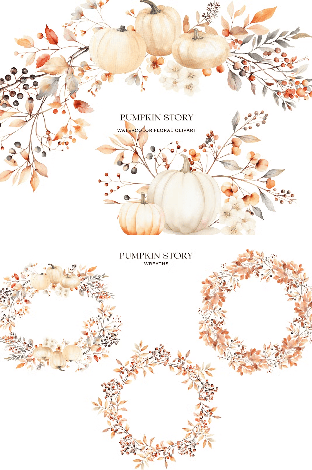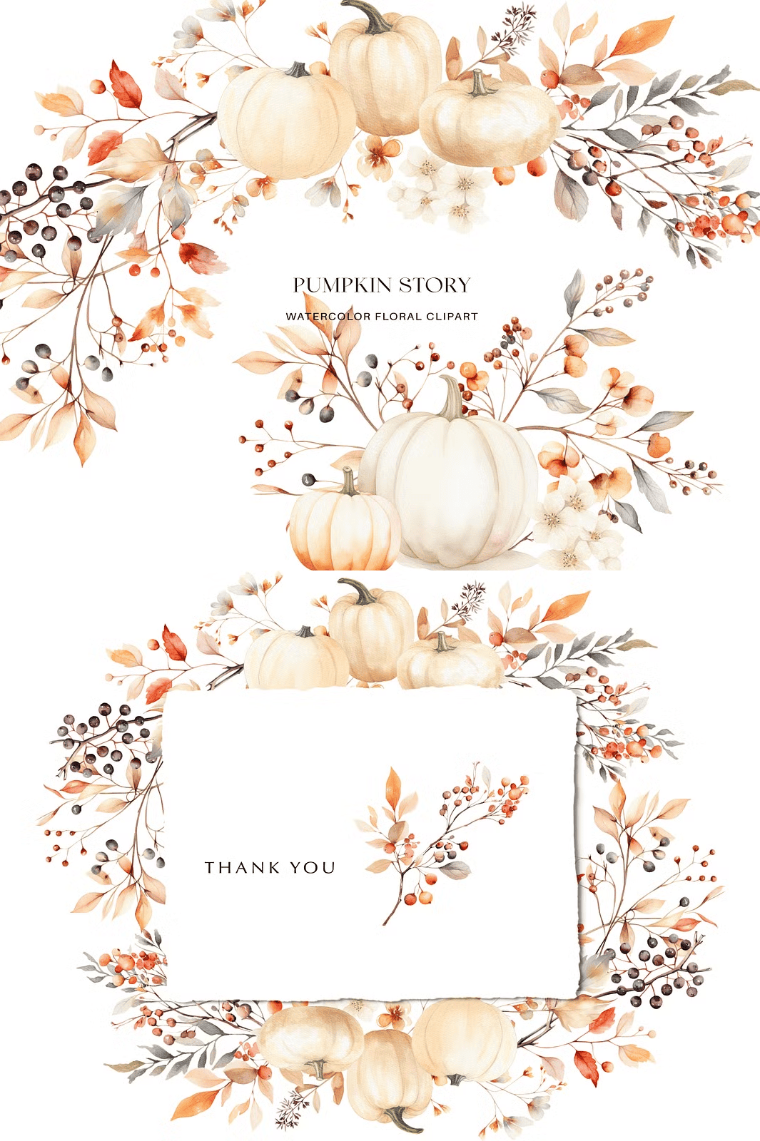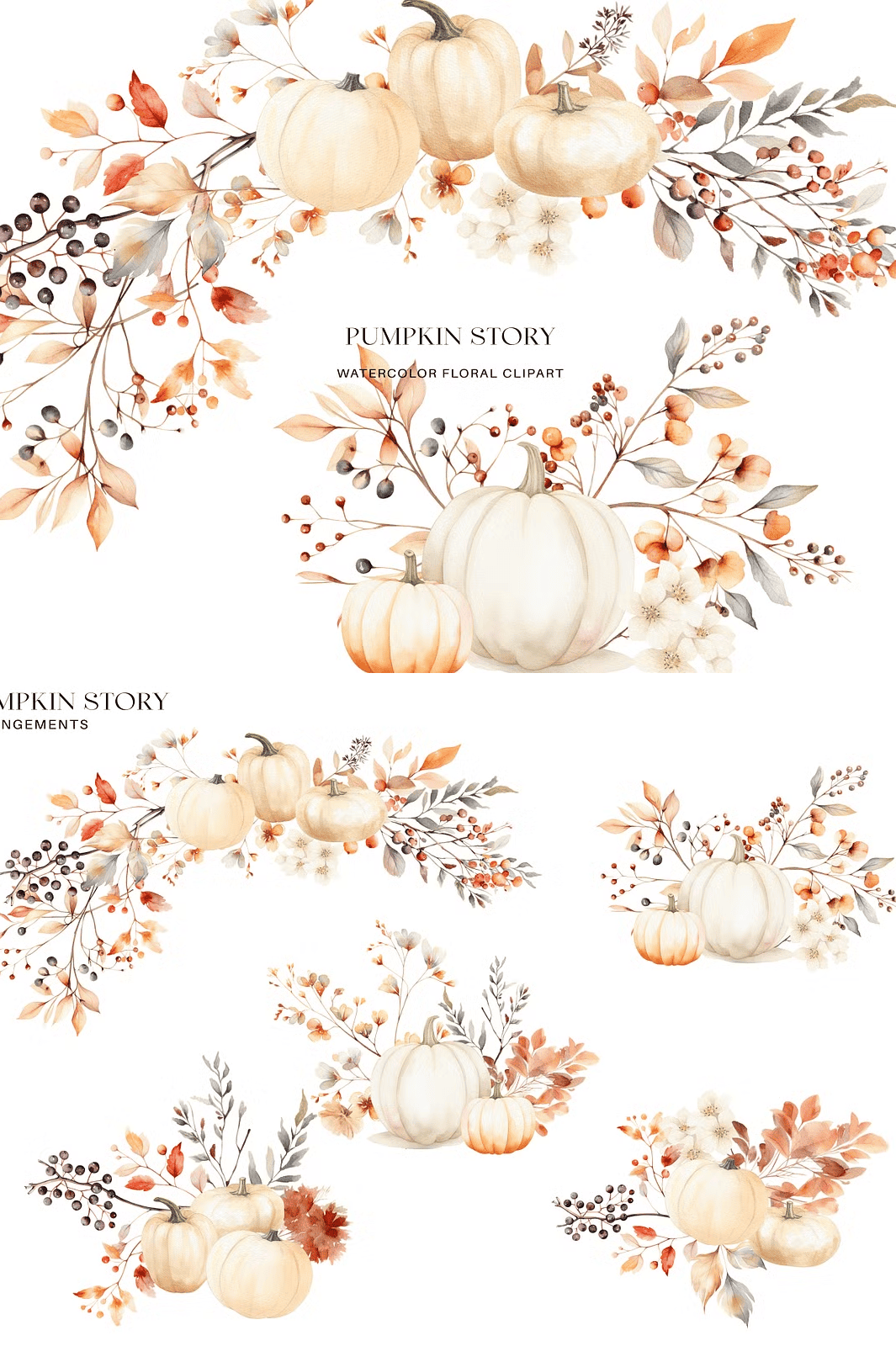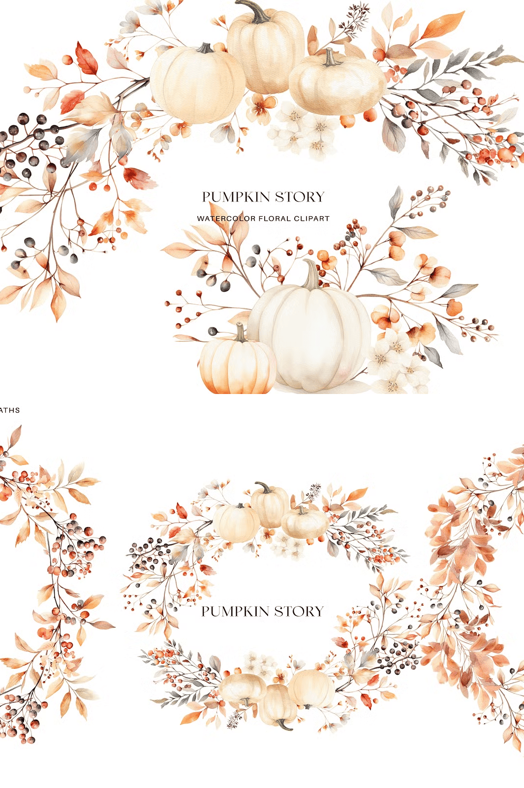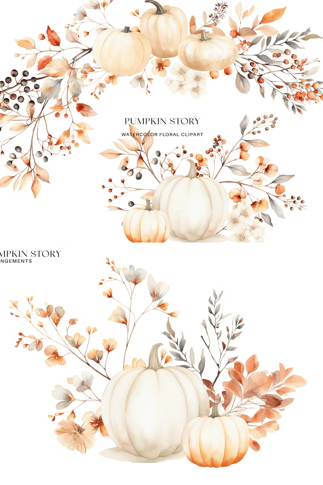 – **5 Arrangements**: Complete, stylized scenes featuring pumpkins, gourds, leaves, and berries — ideal for backgrounds, cover designs, and featured visuals. Each measures approximately 2881 x 1888 px (9.6″ x 6.3″), perfect for print and digital use.