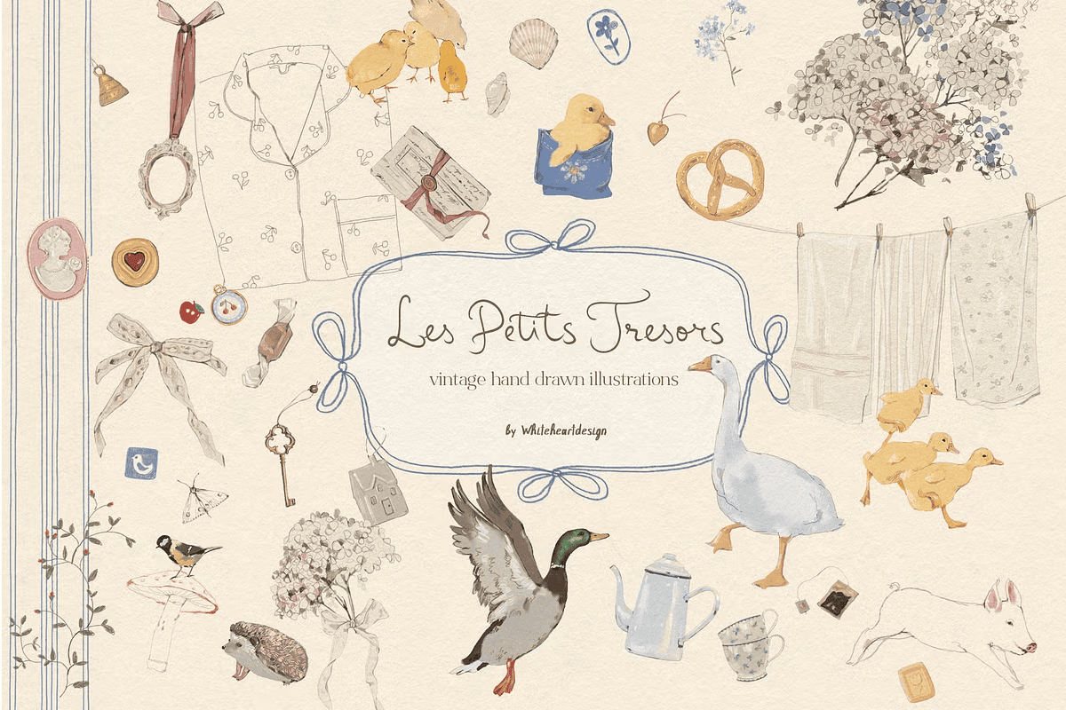 Step into a handcrafted universe filled with gentle nostalgia and playful elegance. The Les Petits Trésors (The Little Treasures) Cottagecore Clipart Collection is more than a digital illustration set — it’s a storytelling archive of delicate, hand-drawn moments. This unique assortment blends soft watercolor washes, fine-line details, and tactile colored pencil textures to capture the spirit of imperfect beauty, making every image feel like a cherished memory from a bygone era.