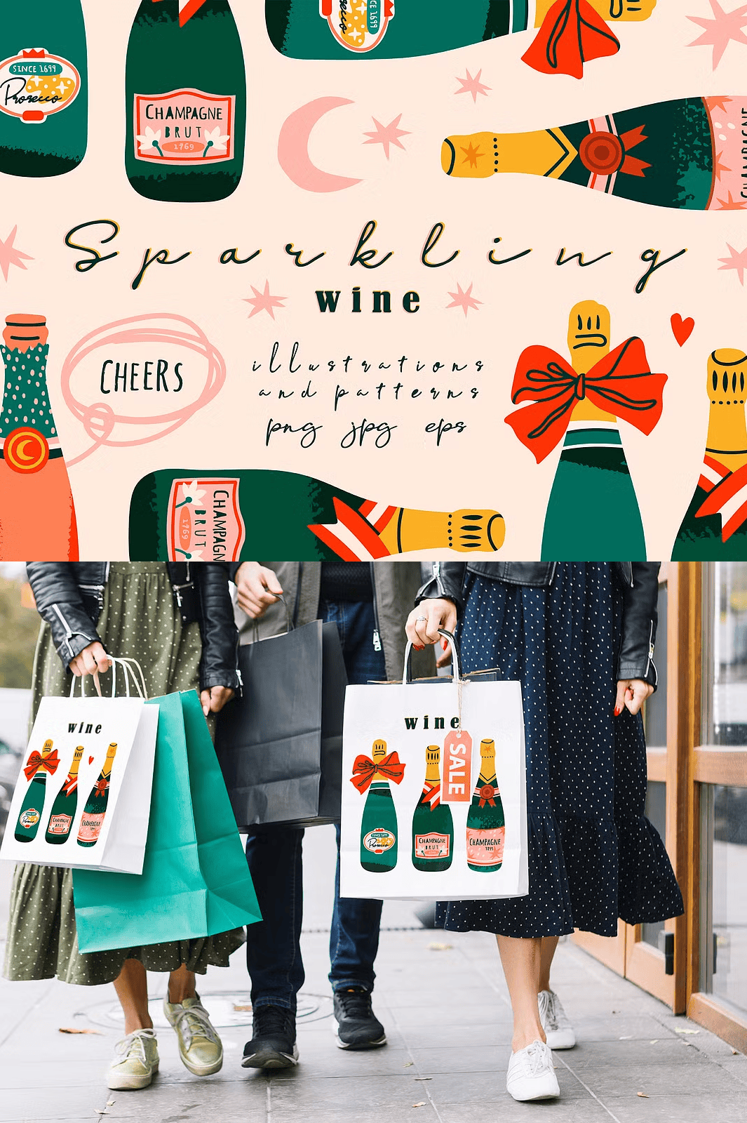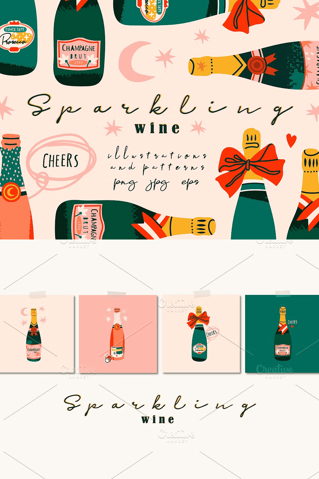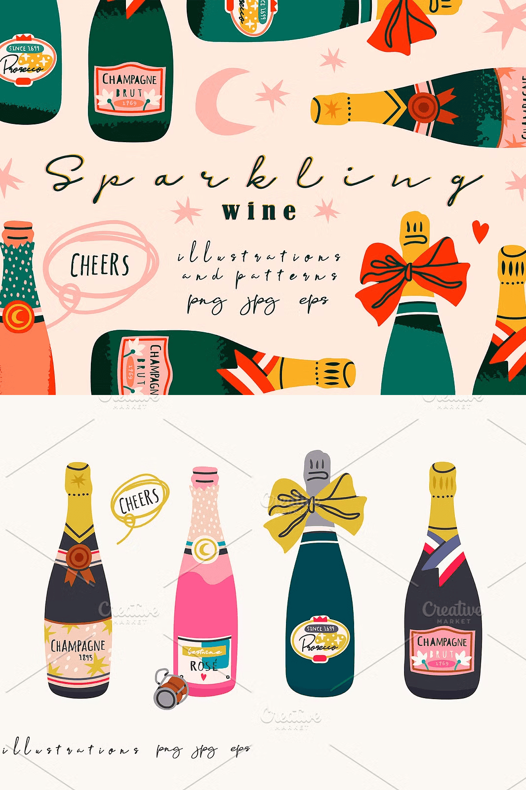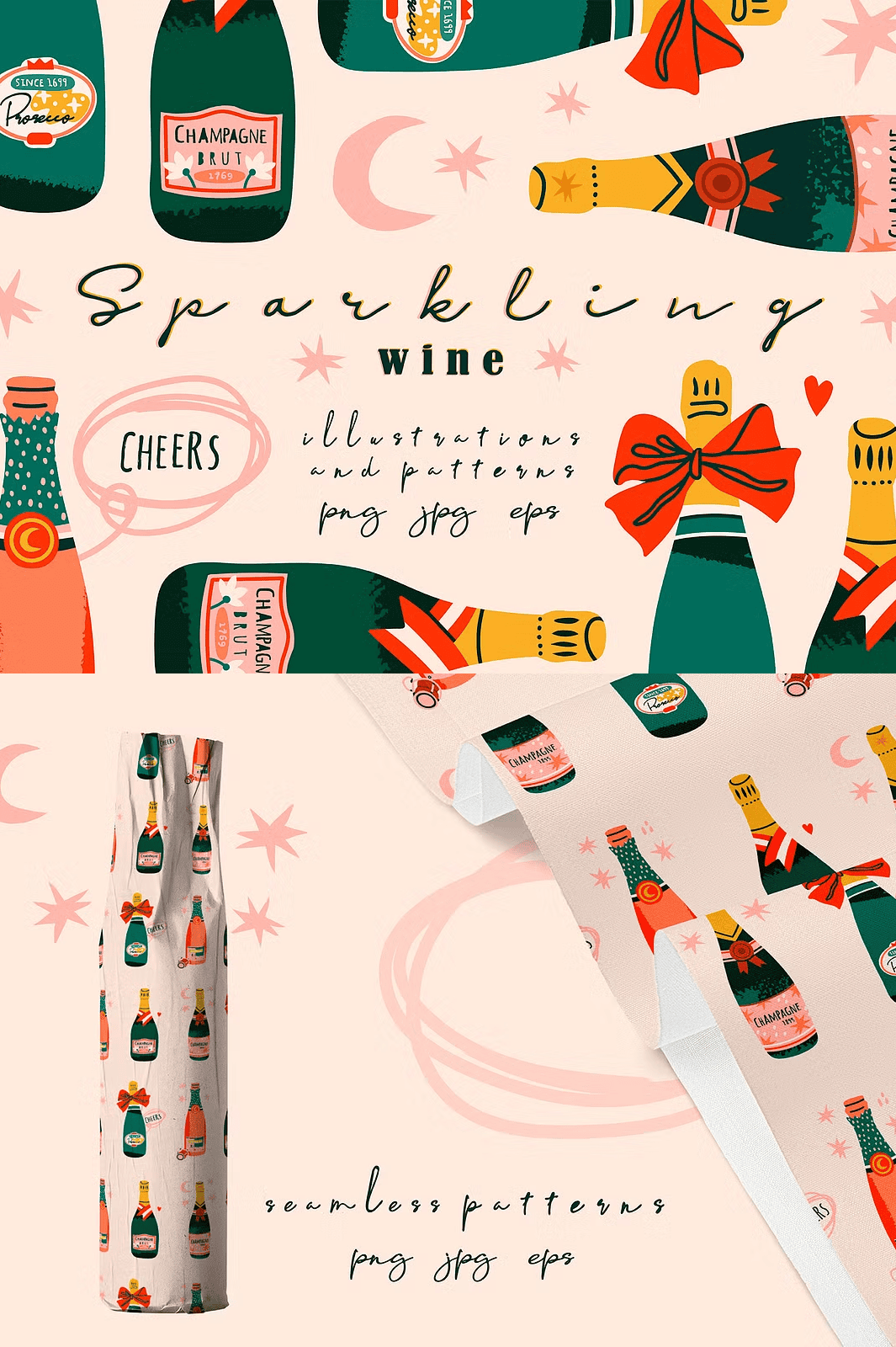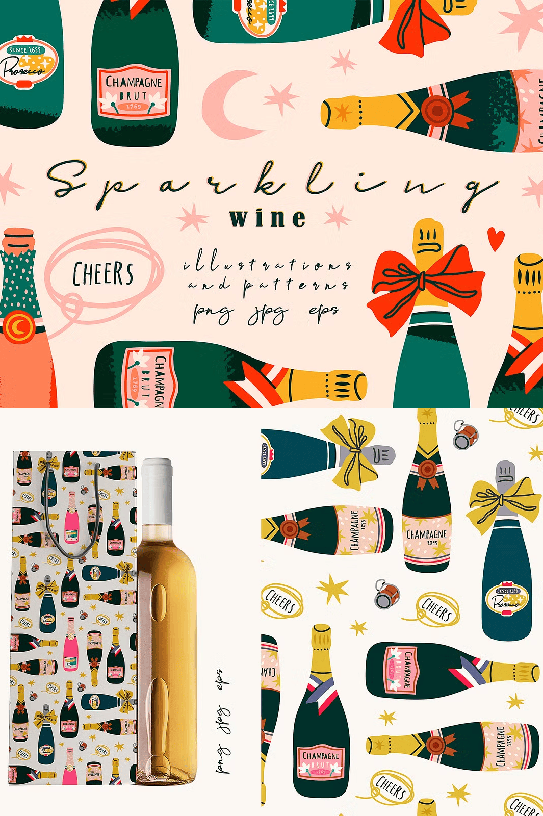 The collection doesn’t stop at bottles. It expands your creative toolkit with 2 **seamless patterns** perfect for backgrounds, textiles, wrap designs, or stationery sets. Think elegant swirls of bubbles, delicate vine motifs, or sparkling grid textures — all crafted in harmony with the minimalist aesthetic.