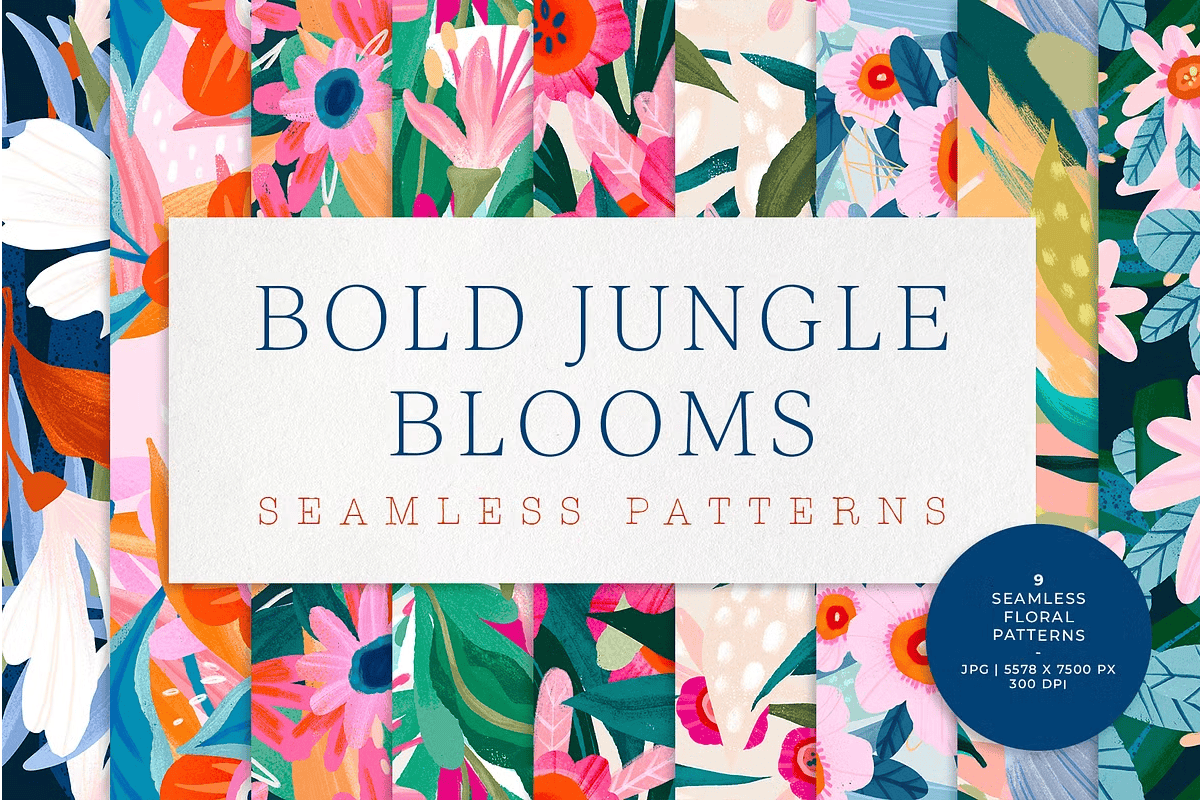 Ignite your next creative project with the Bold Jungle Blooms Seamless Patterns collection — a dynamic fusion of handcrafted floral artistry and high-impact design. This powerful set delivers 9 breathtaking, high-resolution seamless patterns crafted to elevate your work with rich textures, bold color contrasts, and intricate botanical detail. Each pattern bursts with the untamed energy of nature, making it ideal for interior design, fashion, stationery, digital art, and more.