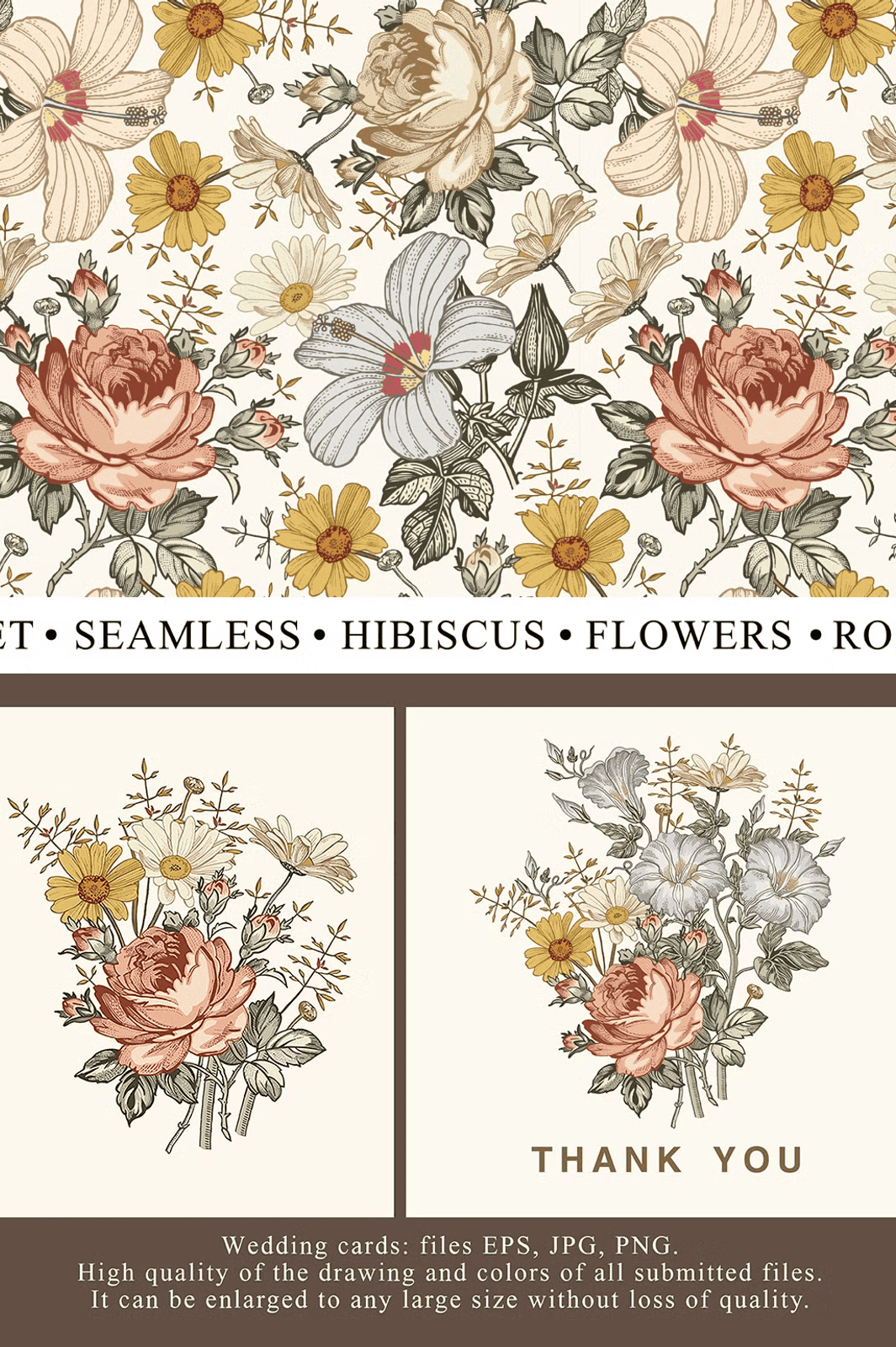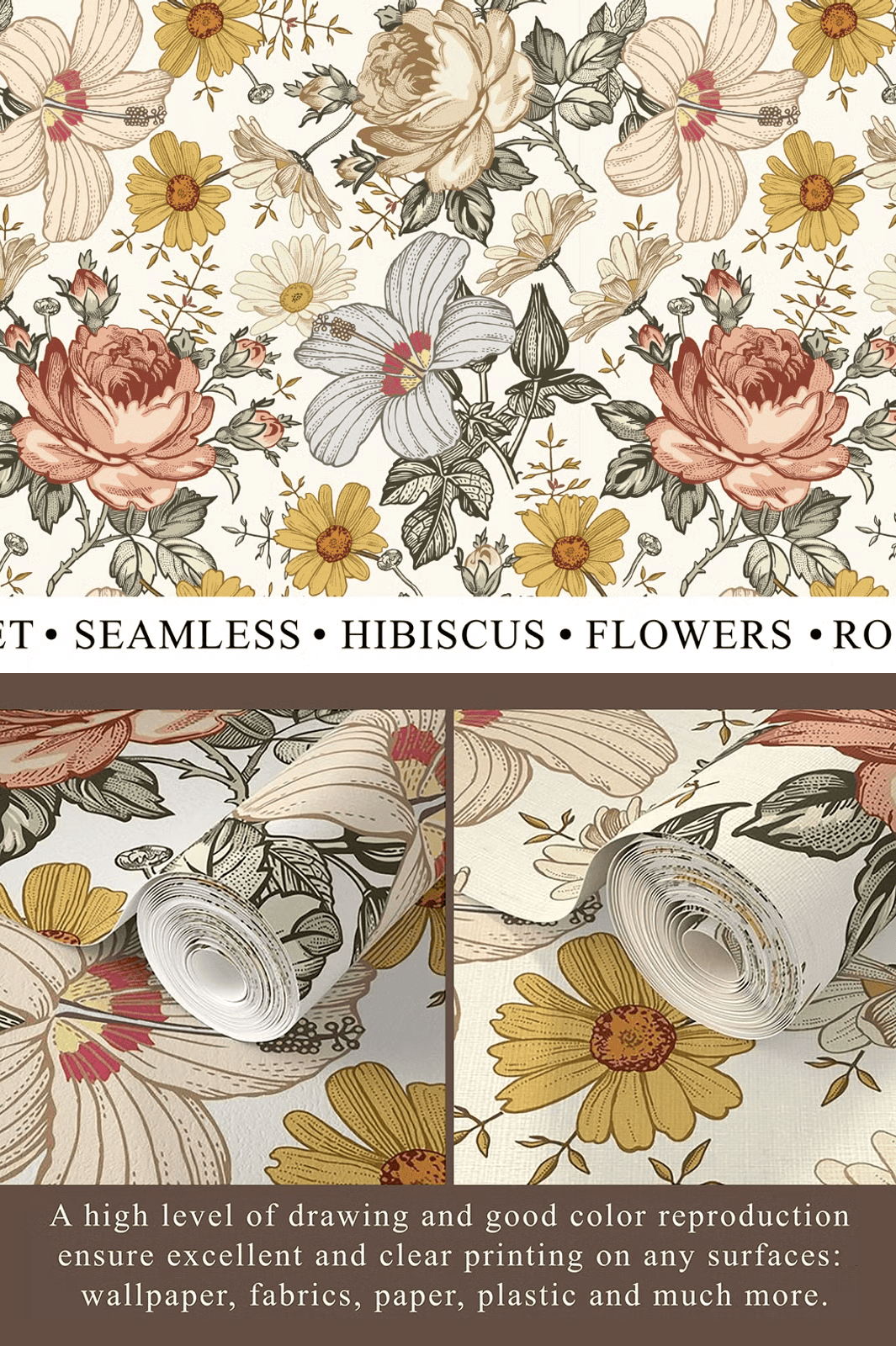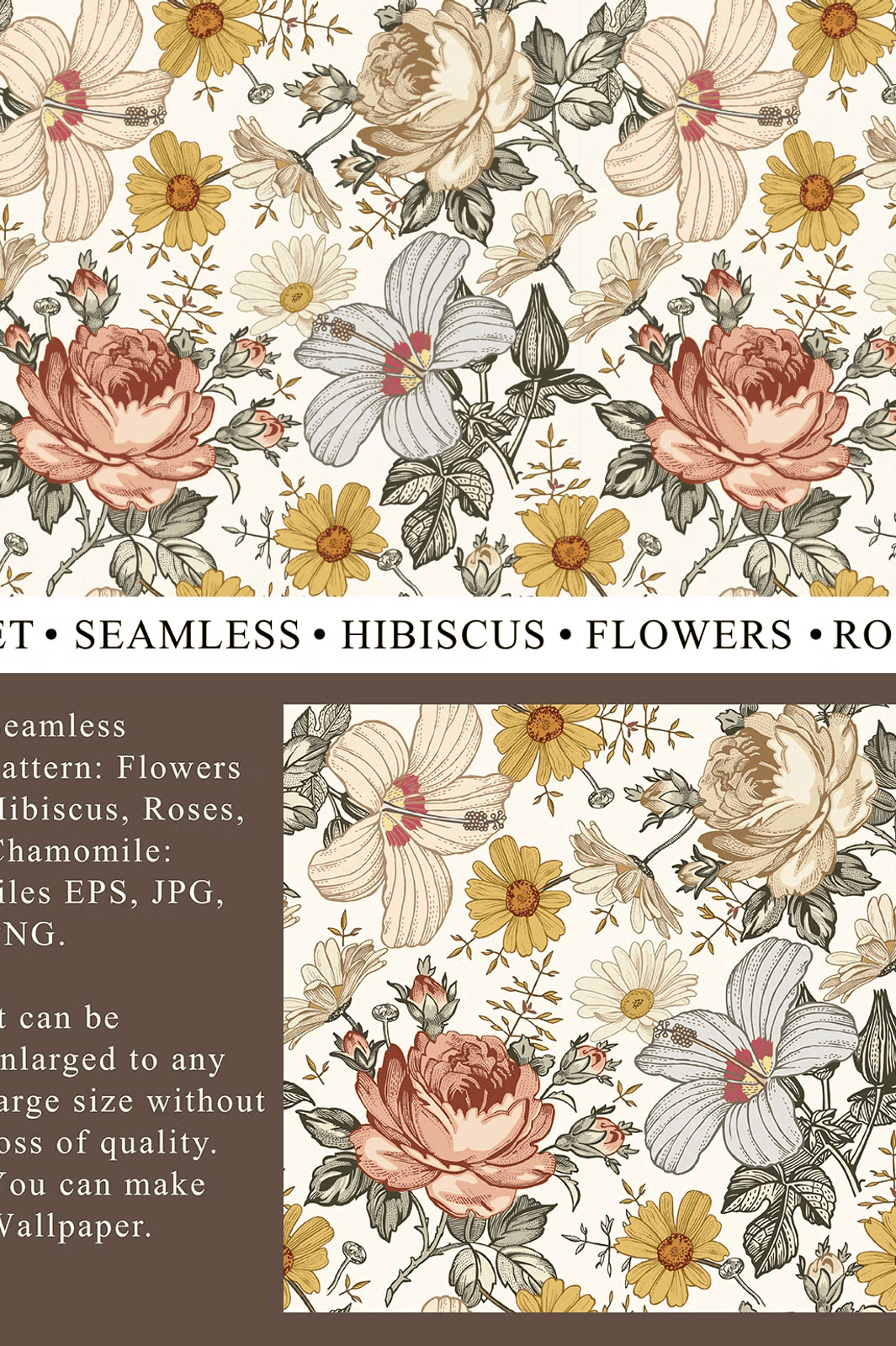 Dive into a world of elegance with intricate patterns featuring chamomile, rose, and hibiscus blossoms—flowers that symbolize purity, passion, and tropical beauty. These seamless backgrounds can be stretched, resized, and recolored infinitely without losing clarity. Perfect for both print and digital applications, this set ensures your designs remain sharp, vibrant, and flawless at any scale.