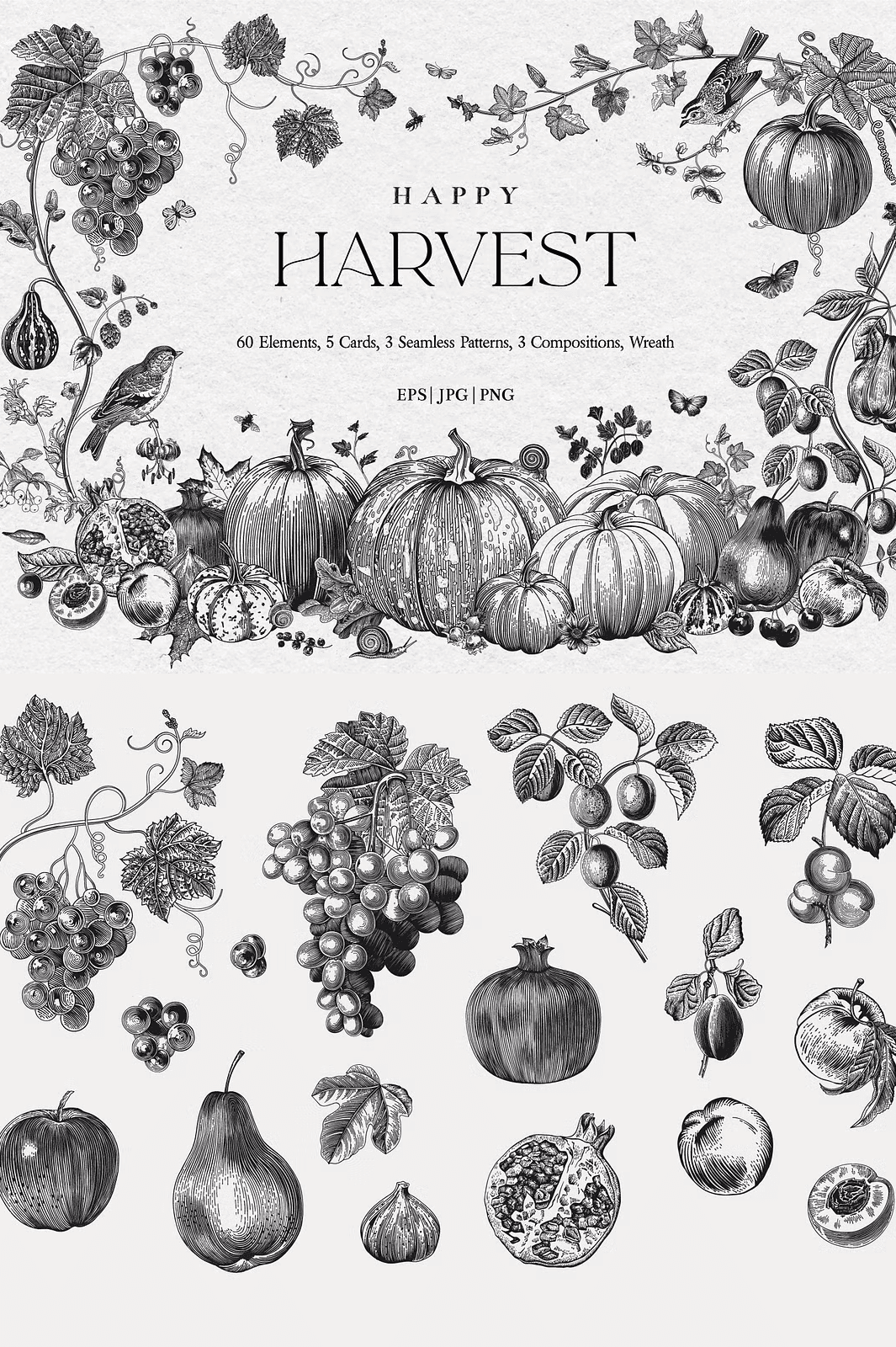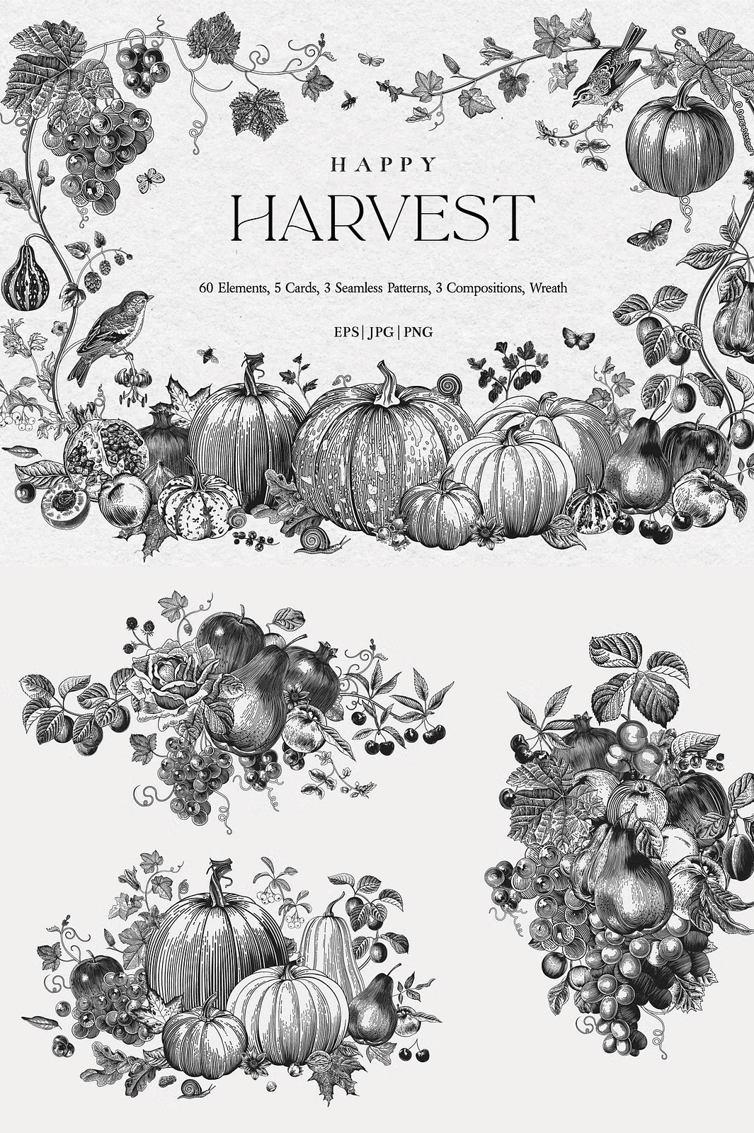 – **PATTERNS**: Seven dynamic patterns designed for large-scale use and seamless tiling. All formats include **EPS (4000×4000 px)** and **JPG (4000×4000 px)** files. These include unique compositions like **Happy Harvest Wreath**, **Harvest Frame**, and **Autumn Tree Design**, perfect for backgrounds, textures, and themed branding.