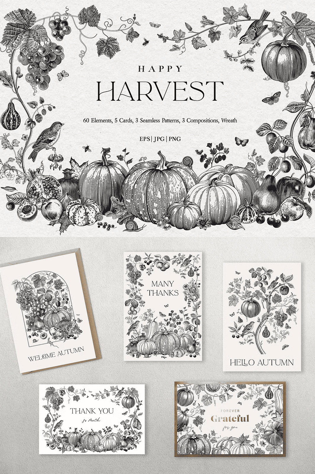 – Design **Thanksgiving greeting cards** with layered pumpkin wreaths, elegant berry borders, and expressive bird illustrations