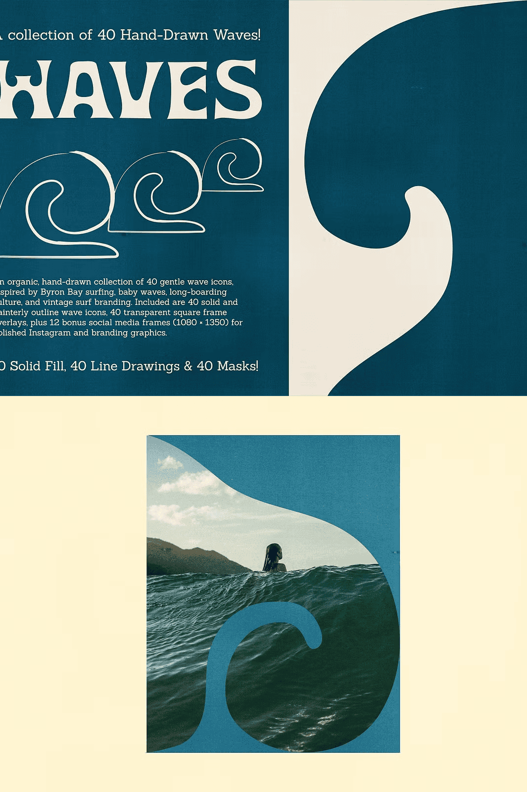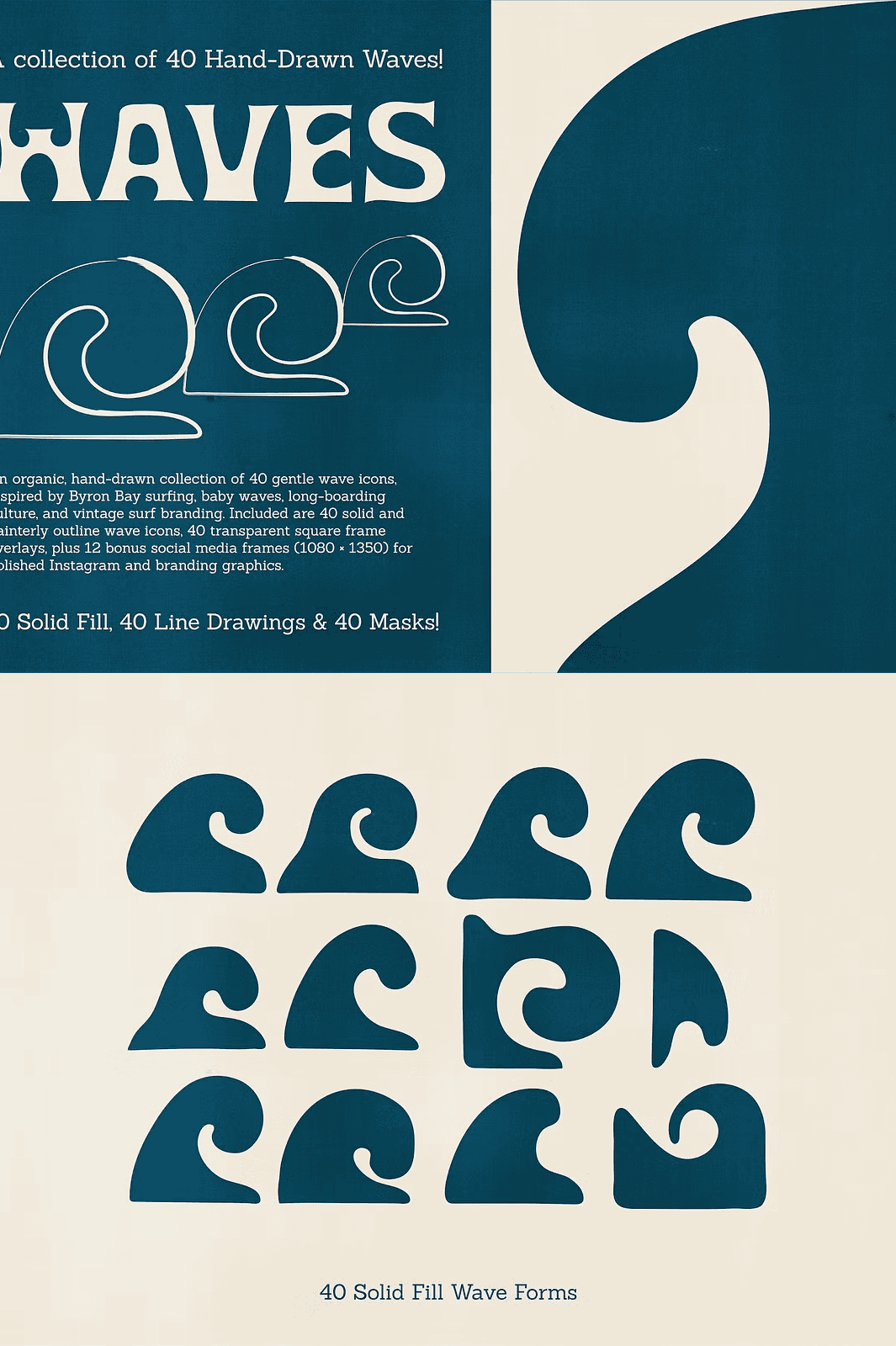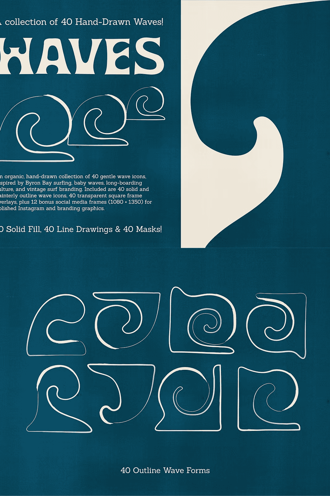 This collection delivers **40 solid fill wave icons** and **40 painterly outline versions**, giving you unmatched versatility. Choose the bold, confident look of solid fills for strong visual impact in logos, packaging, and branding. Or, opt for the soft, delicate touch of hand-illustrated outlines to create calming, minimalist designs perfect for wellness brands, journals, or editorial layouts.