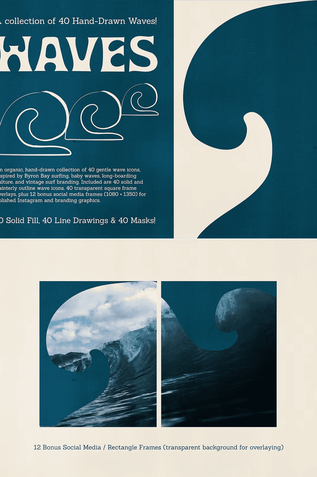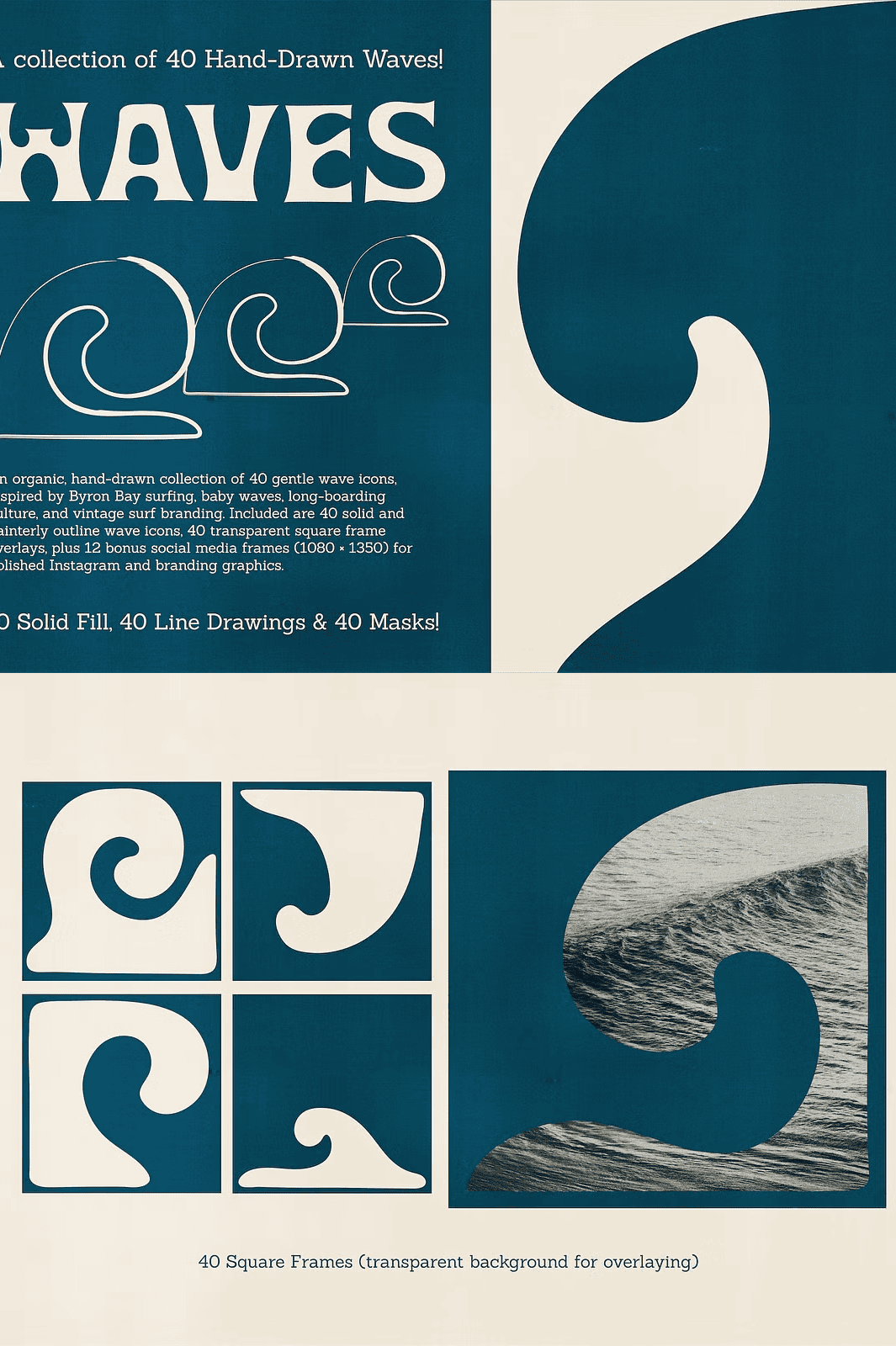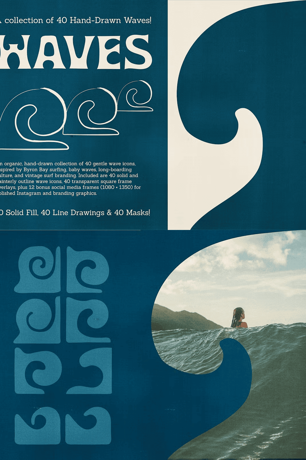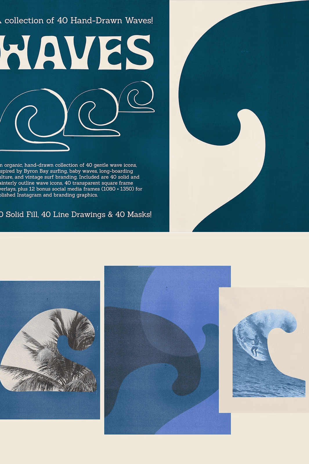 This collection delivers **40 solid fill wave icons** and **40 painterly outline versions**, giving you unmatched versatility. Choose the bold, confident look of solid fills for strong visual impact in logos, packaging, and branding. Or, opt for the soft, delicate touch of hand-illustrated outlines to create calming, minimalist designs perfect for wellness brands, journals, or editorial layouts.