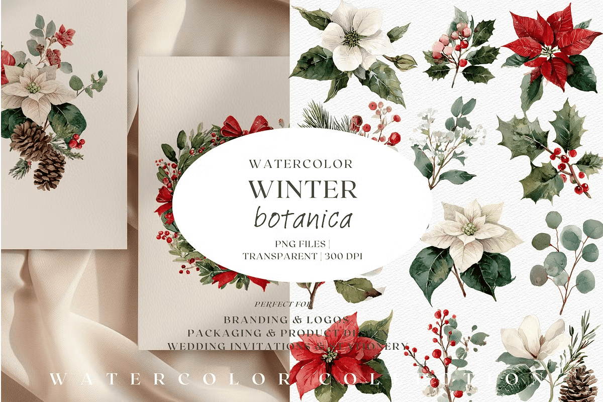 – **20 Lush Flowers & Blooms**: Capture the quiet romance of winter botanicals with detailed depictions of poinsettias, hellebores, and flowering branches, ideal for invitation design, digital cards, and seasonal branding.