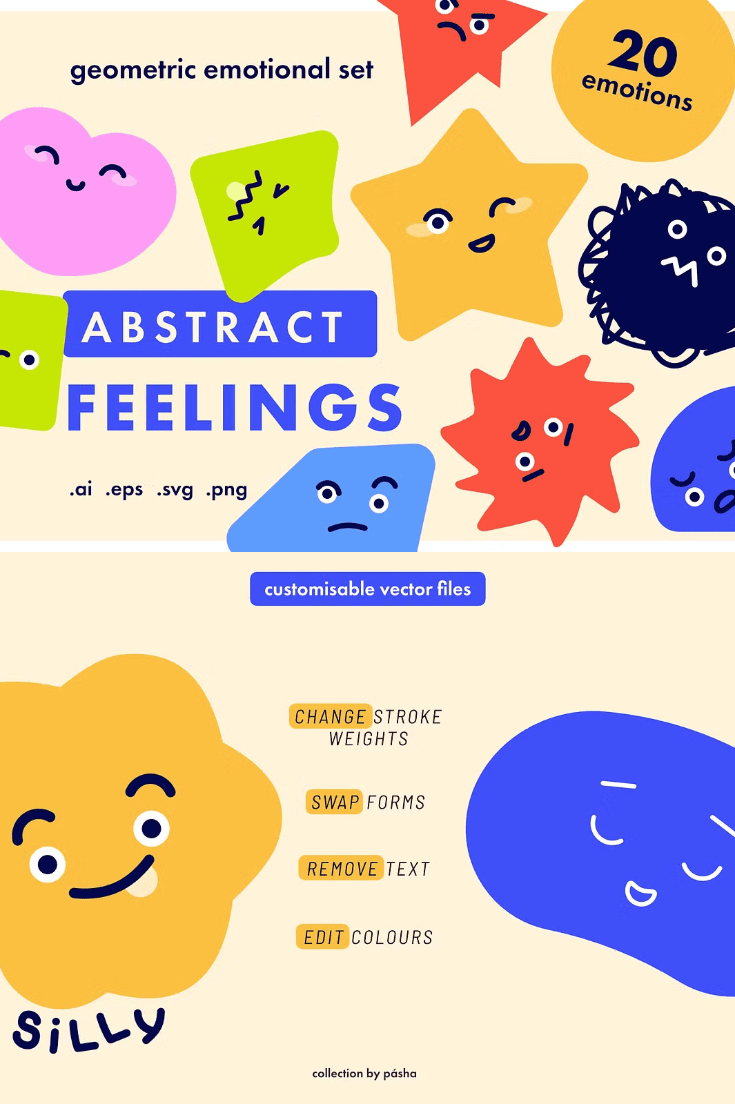 Each illustration is fully editable, giving you complete control over color, form, and expression. From joy and curiosity to intensity and calm, these designs help you visually articulate emotions in a modern, artistic way.