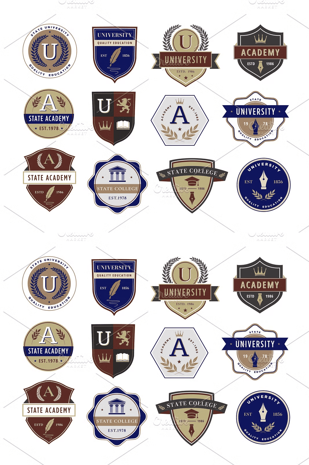 Elevate your institutional branding with this meticulously crafted vector set of education emblems, designed for universities, colleges, academies, and academic organizations. Each emblem features timeless, classic typography and symbolic elements—laurel wreaths, shields, scrolls, books, and scholarly motifs—reflecting centuries of academic tradition. These high-quality, scalable vector files are ideal for creating official badges, logos, certificates, academic regalia, presentation slides, and institutional promotional materials.