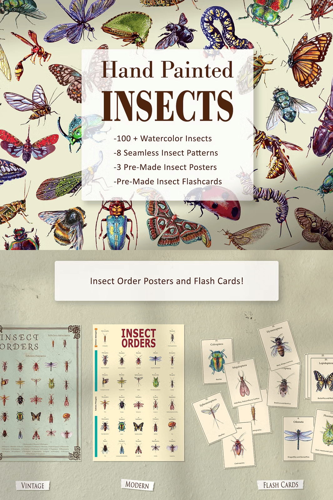 Transform your classroom, study space, or creative workspace with **3 custom-designed insect order posters** and **27 professional flashcards** that organize insects by biological order. These include: