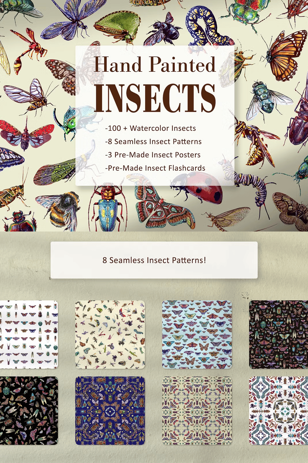 Add dynamic structure and natural charm to your creative work with **8 ready-to-use seamless insect patterns**, perfect for apparel, wrapping paper, stationery, phone cases, fabric, and digital backgrounds.