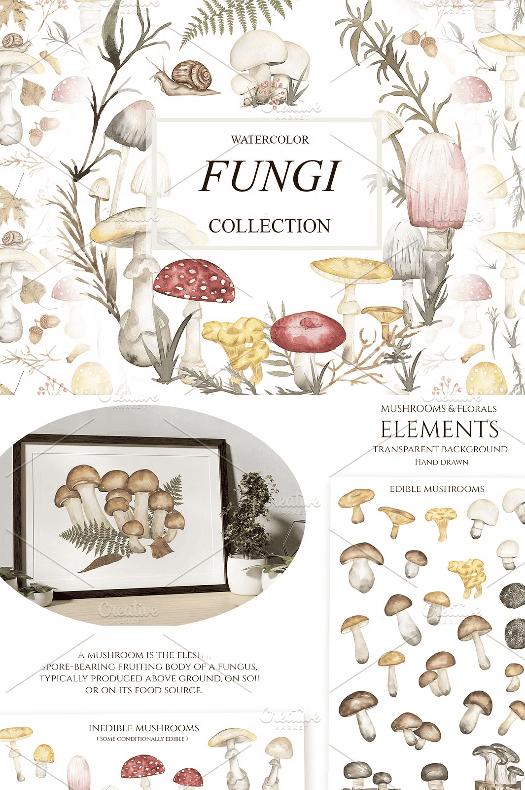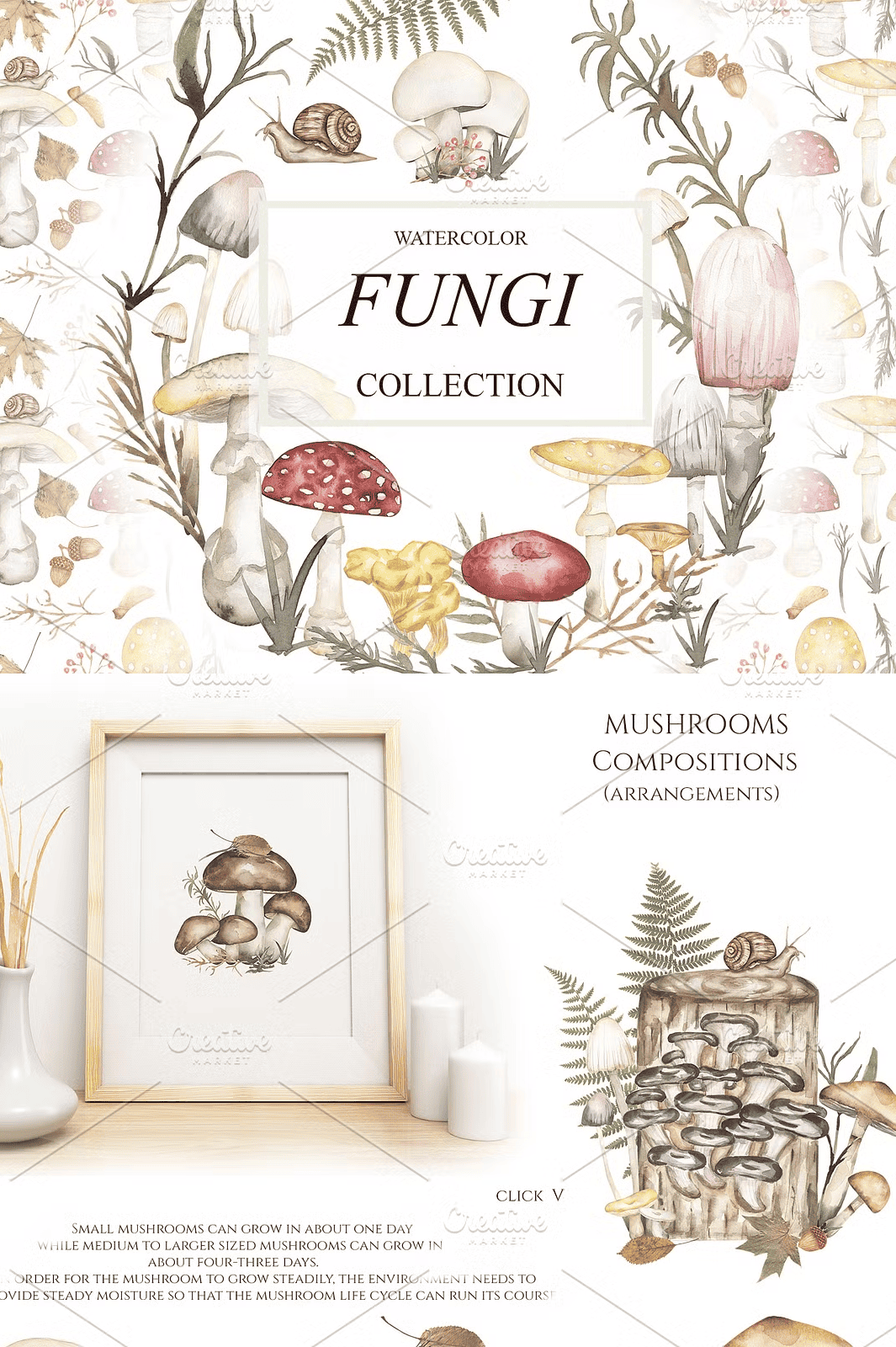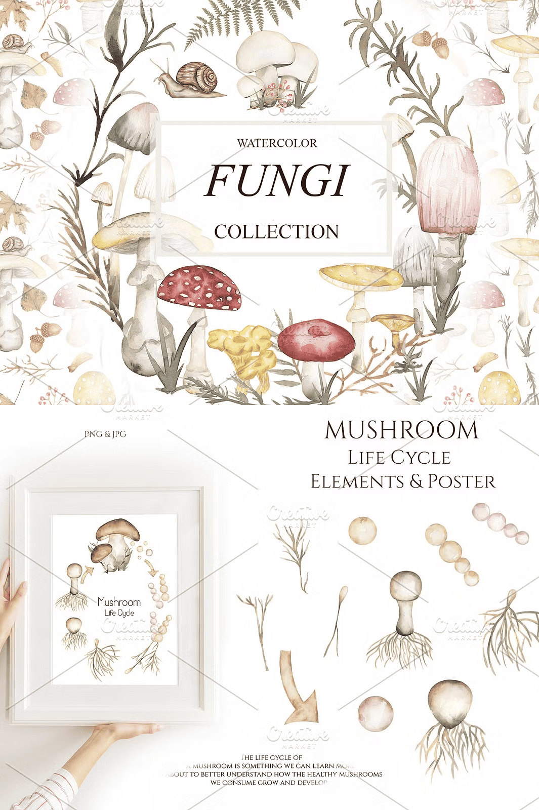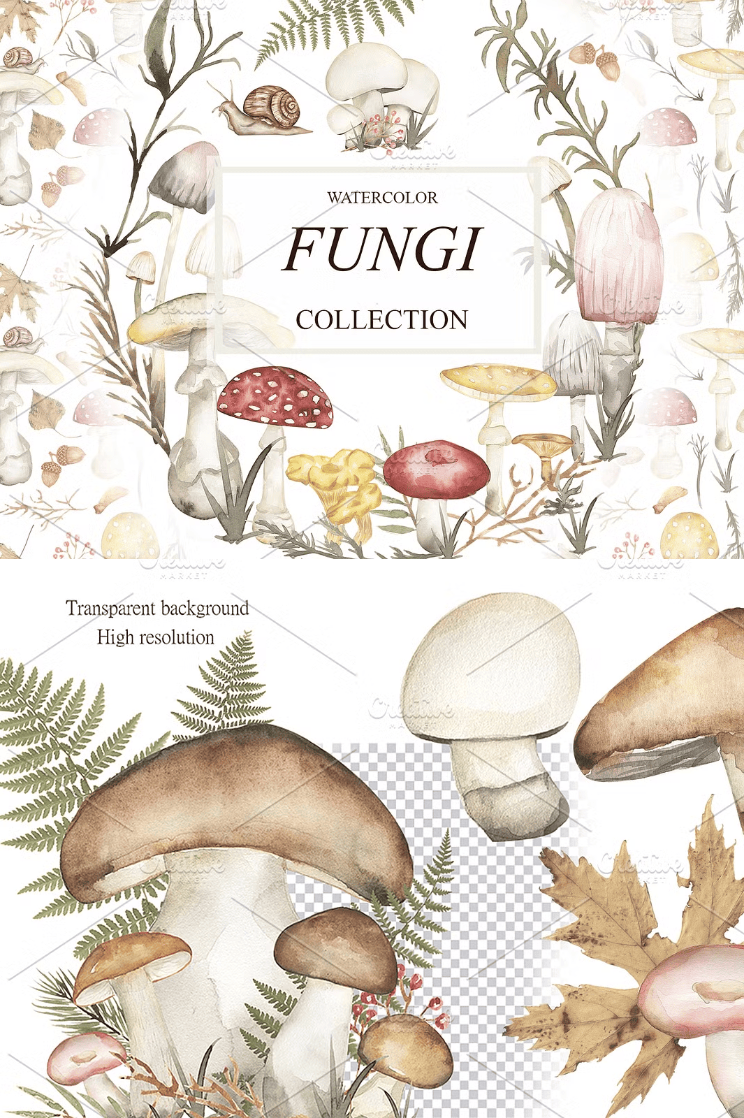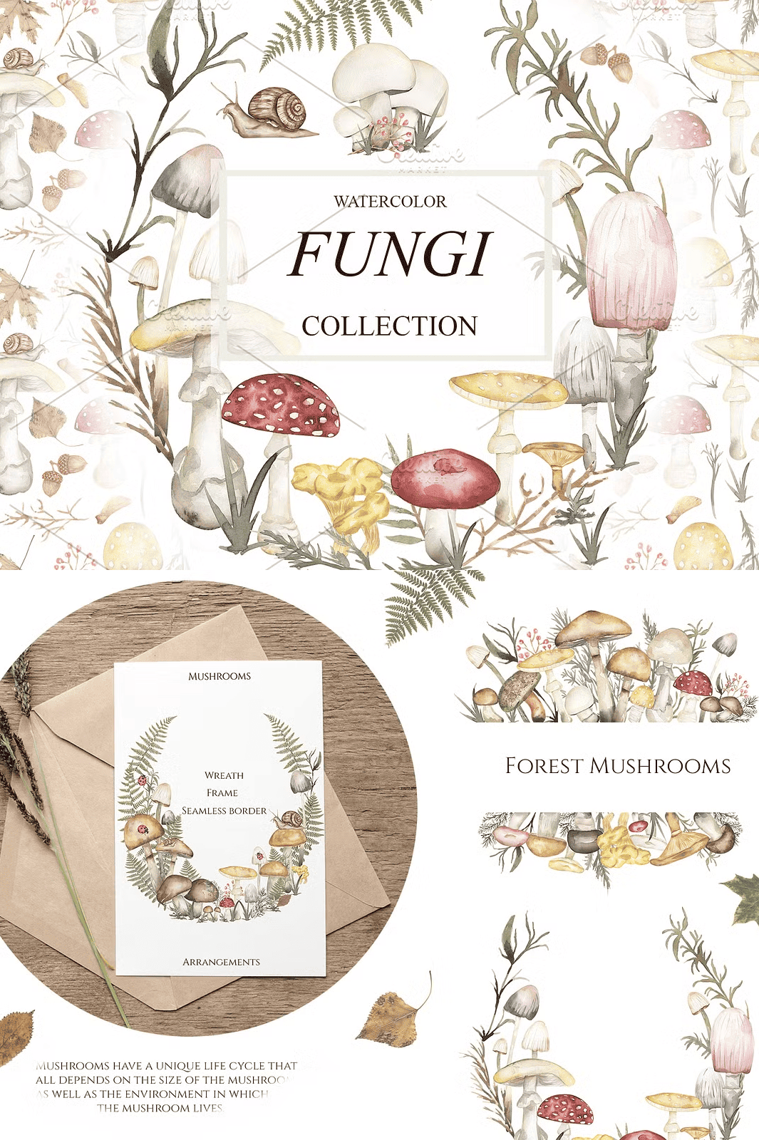 – **7 Creative Compositions** – Ready-to-use groupings of mushrooms and flora for instant use in invitations, posters, and packaging.