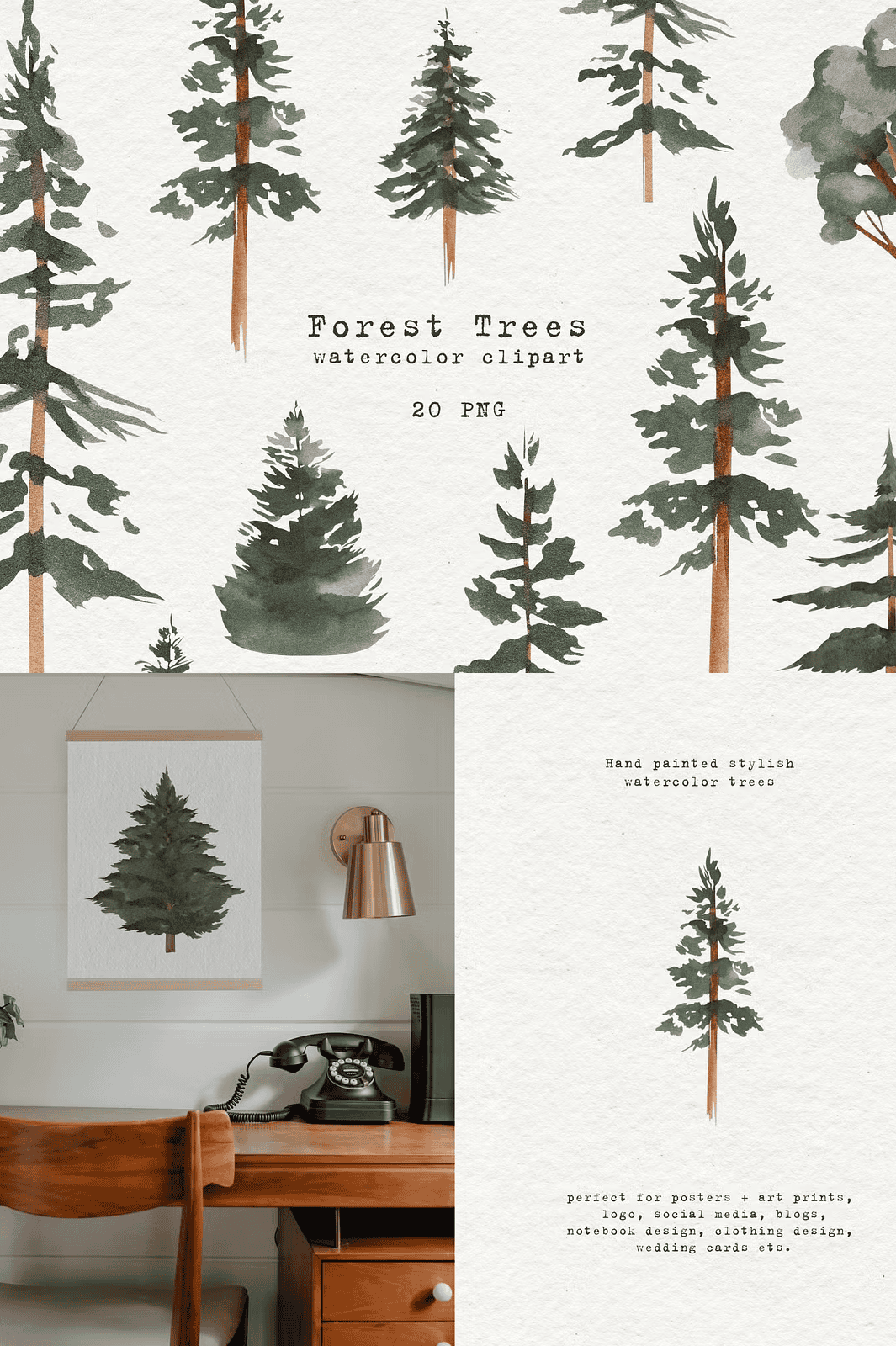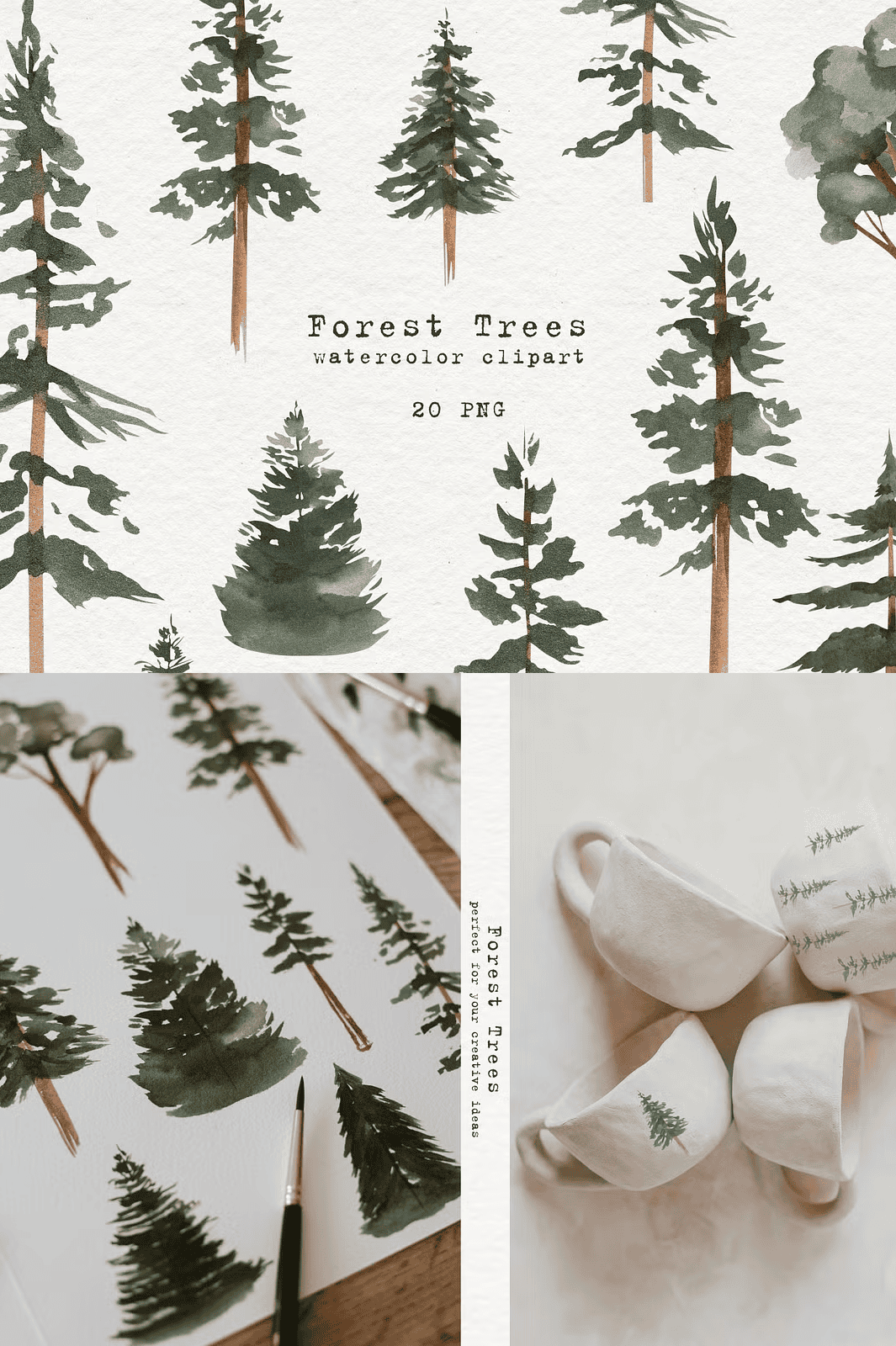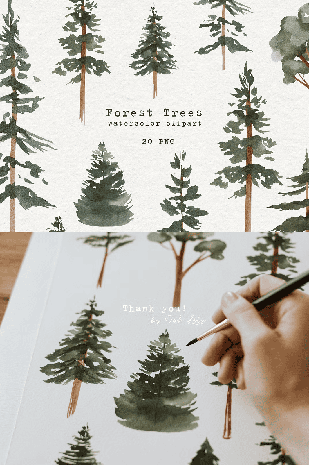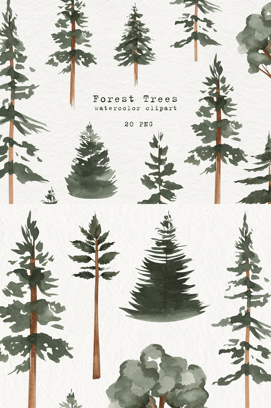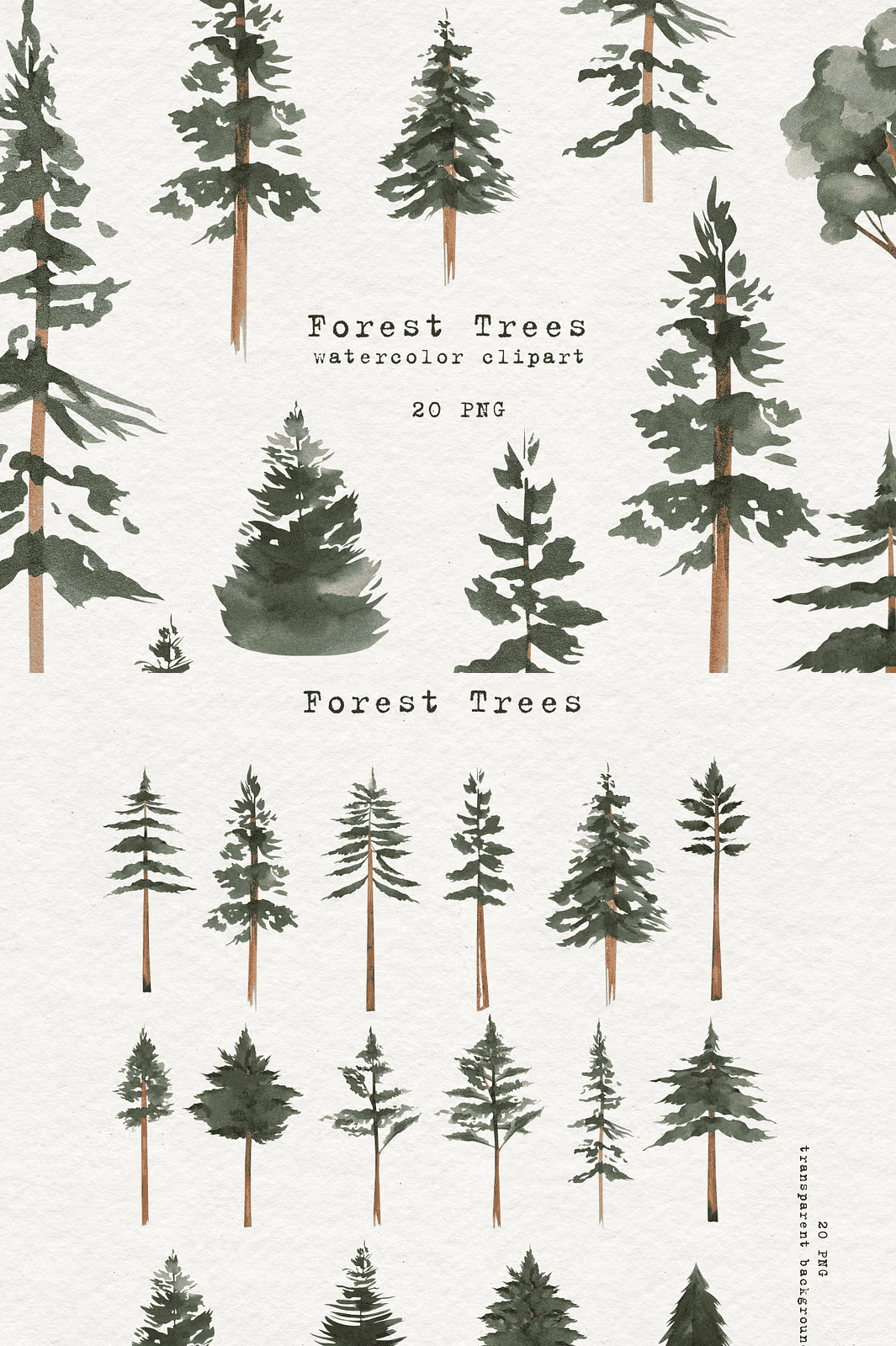 – 20 original hand-painted illustrations of evergreen and pine trees