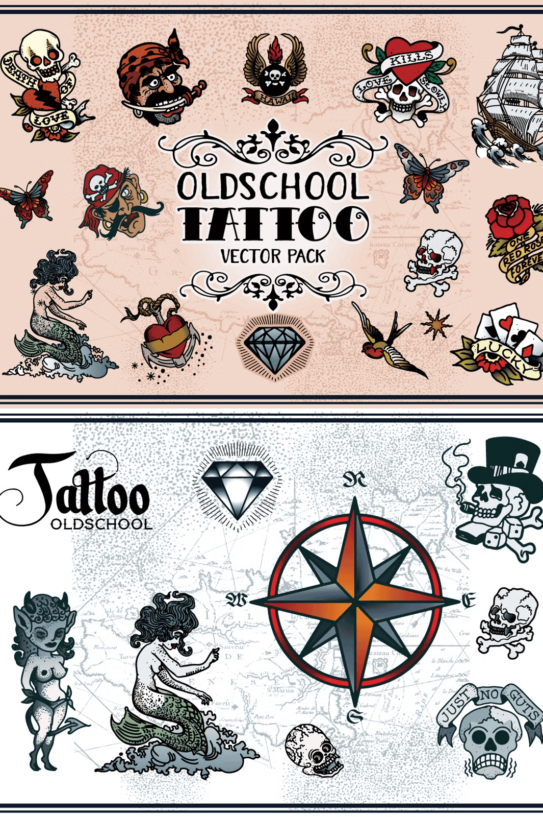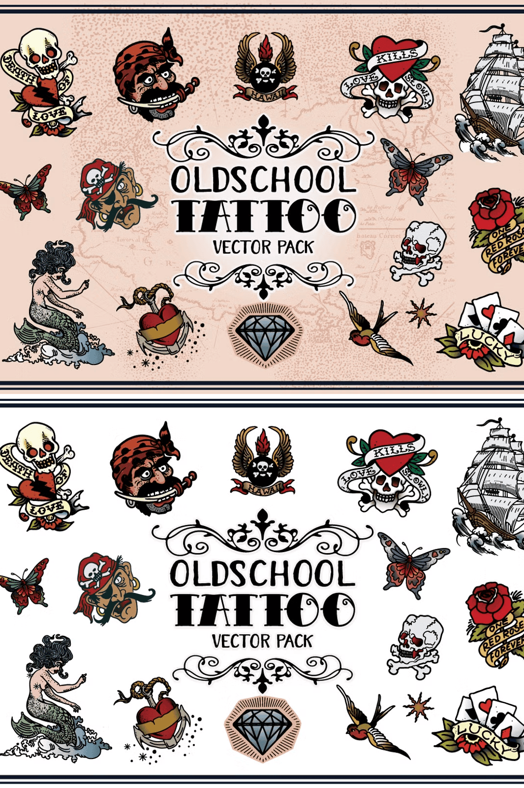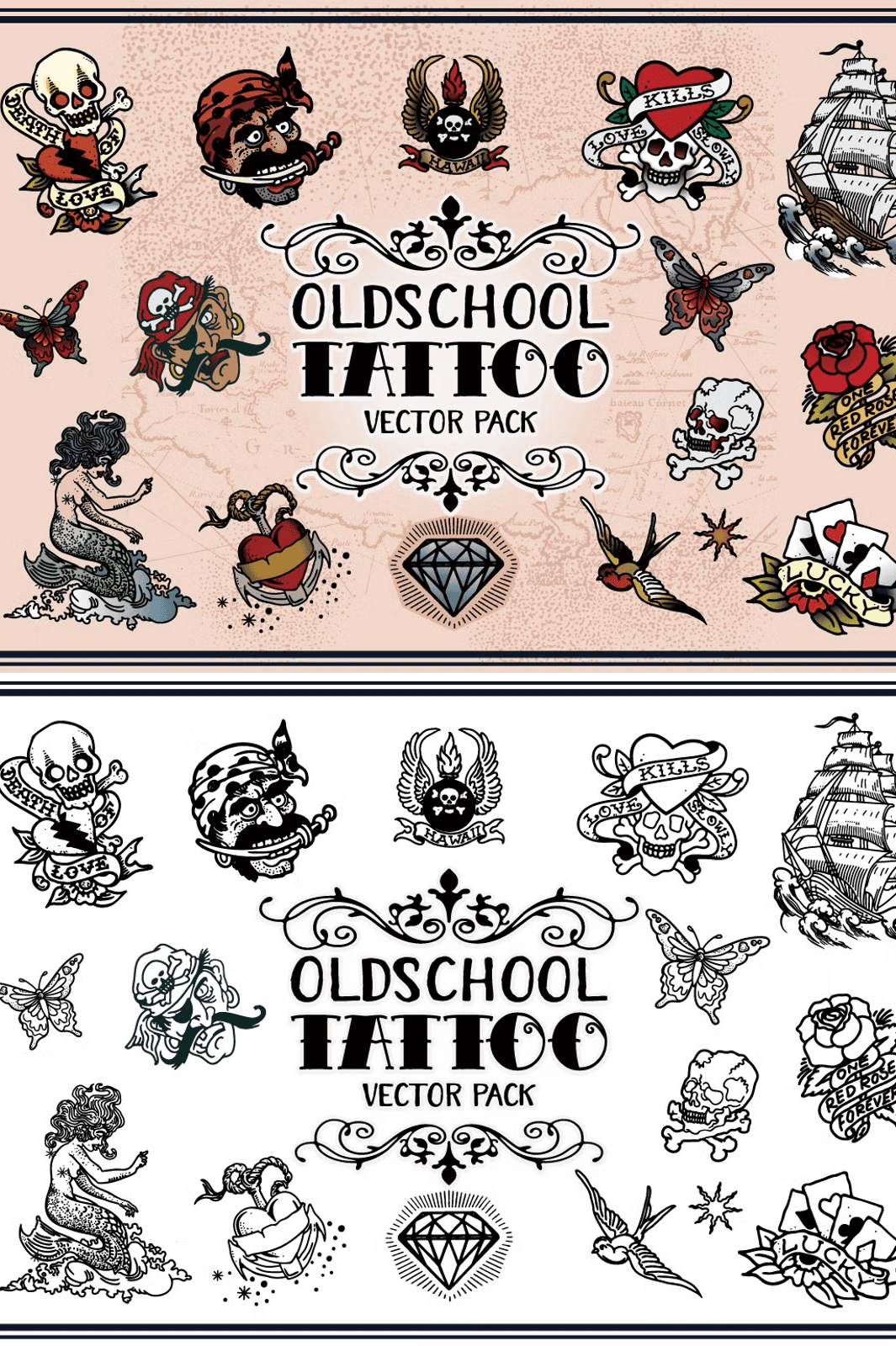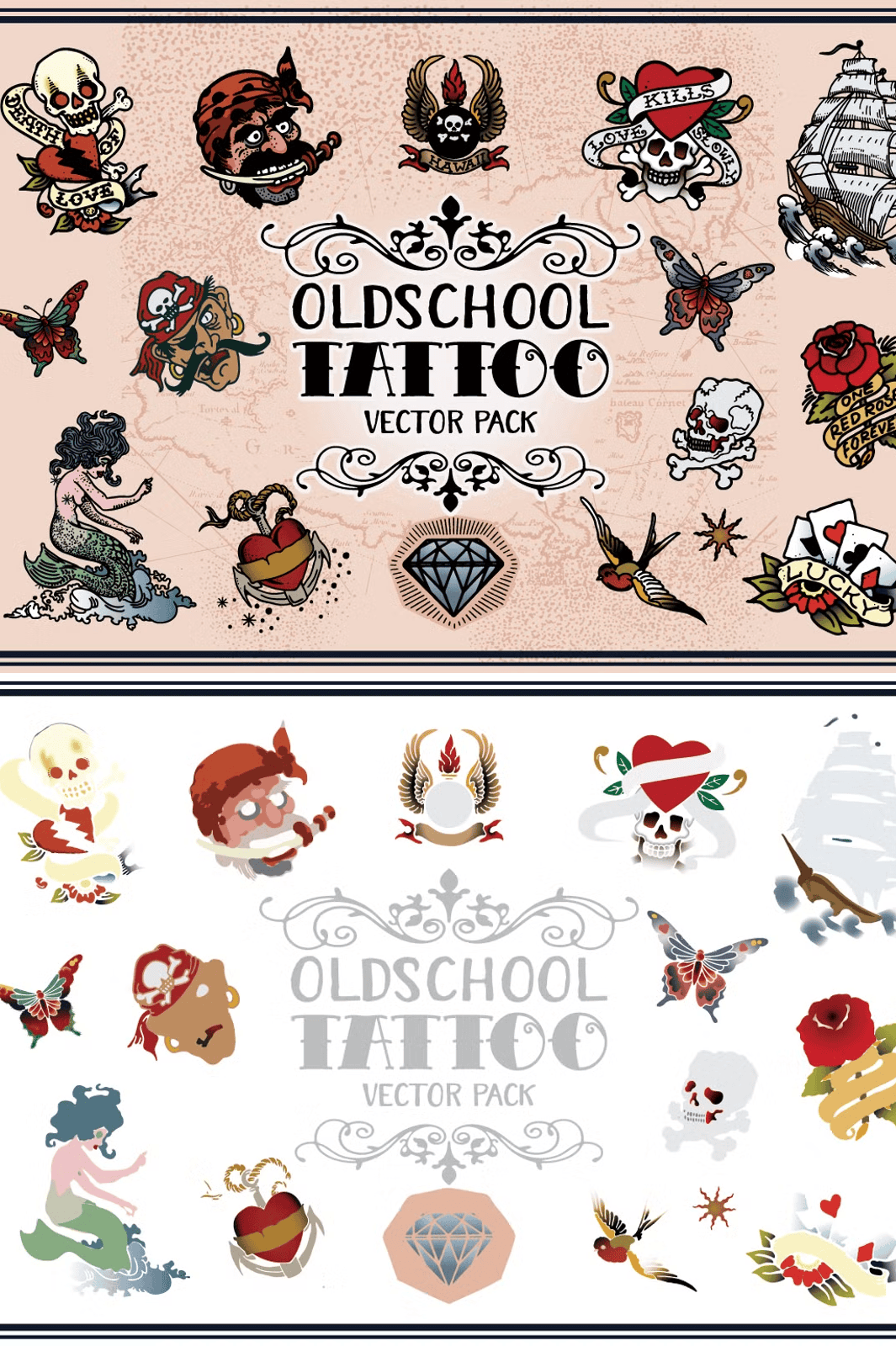 These designs capture the essence of **Sailor Jerry’s iconic tattoo style**: bold outlines, rich color contrast, and a raw, artistic authenticity. From anchors and swallows to vintage ships and tribal flourishes, each illustration radiates the rugged charm of Polynesian tattooing. The color gamut is carefully balanced for strong visual impact while remaining versatile for modern interpretations. Whether you’re creating wearable art, stage visuals, or digital collectibles, these vectors deliver that authentic, vintage tattoo vibe with a contemporary edge.