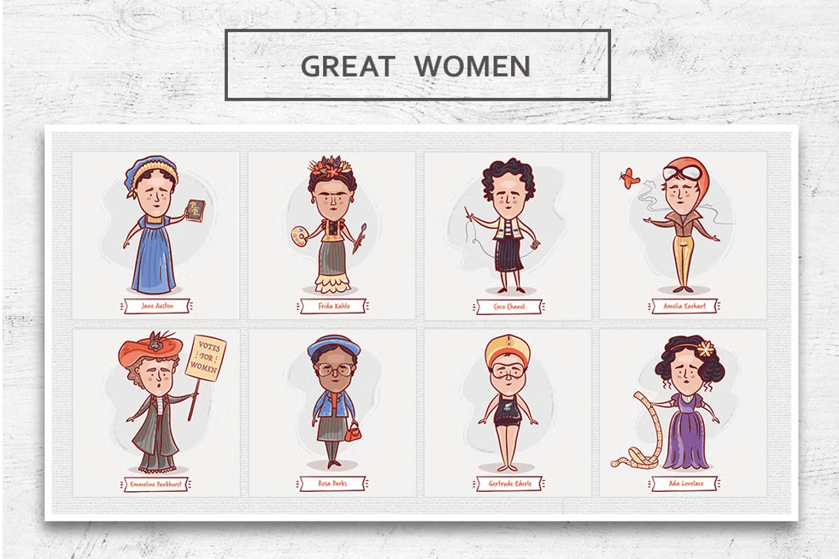 Celebrate the courage, brilliance, and lasting impact of eight extraordinary women who transformed history. This premium collection delivers **8 meticulously crafted vector illustrations** of trailblazing figures: **Frida Kahlo, Jane Austen, Amelia Earhart, Coco Chanel, Emmeline Pankhurst, Gertrude Ederle, Ada Lovelace, and Rosa Parks**. Each portrait captures their essence with accuracy and artistic depth, making them ideal for projects that honor progress, innovation, and equality. Whether designing educational content, motivational posters, or branding materials, these illustrations inspire action, spark conversation, and elevate any creative narrative.