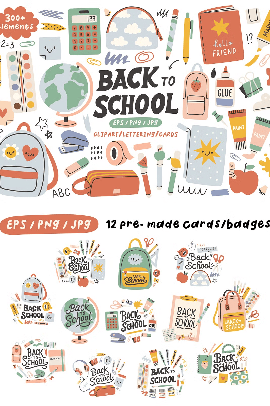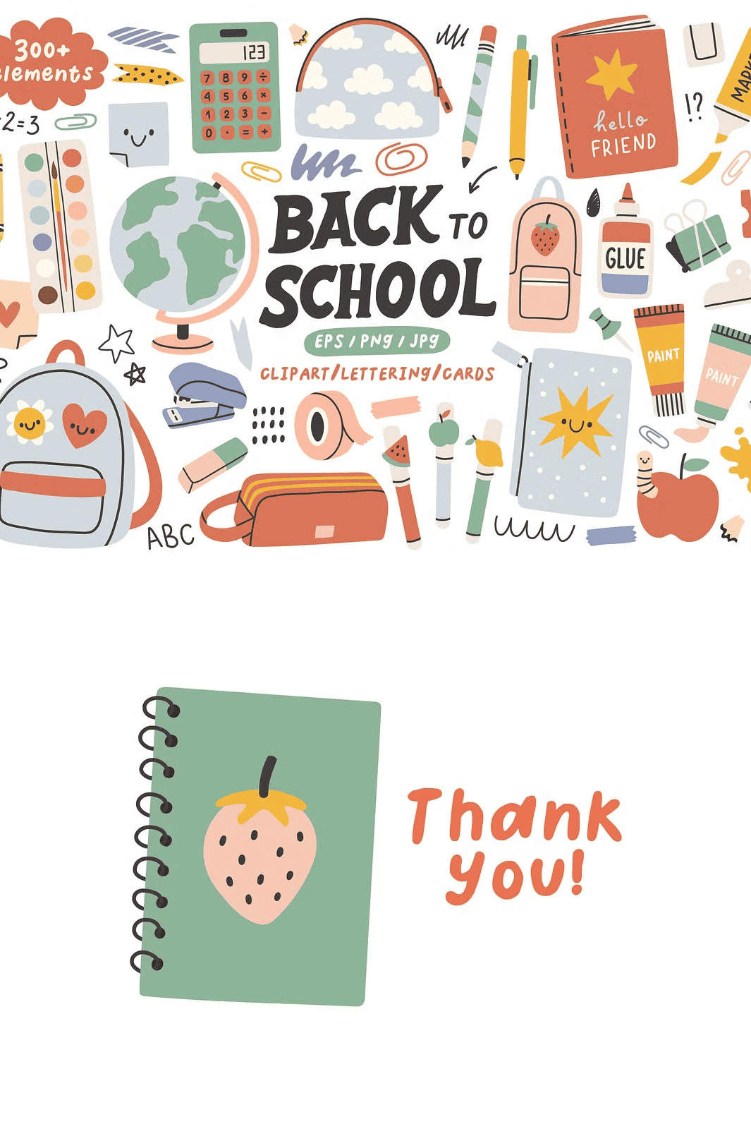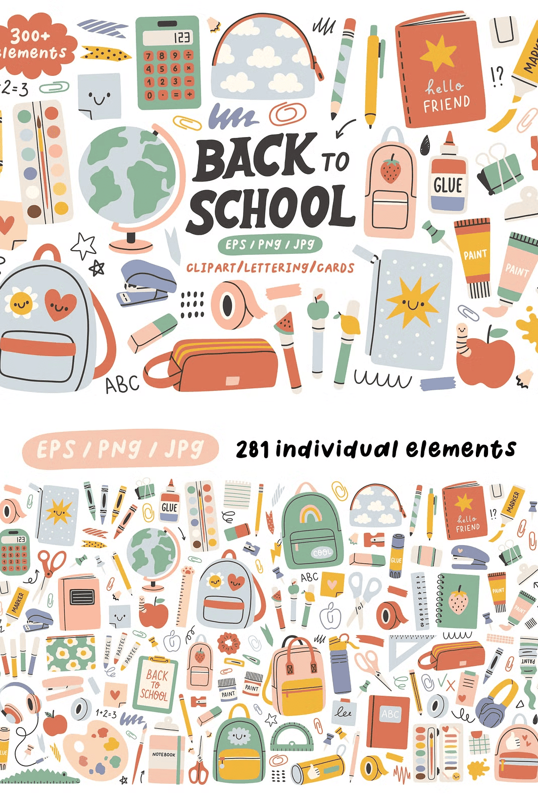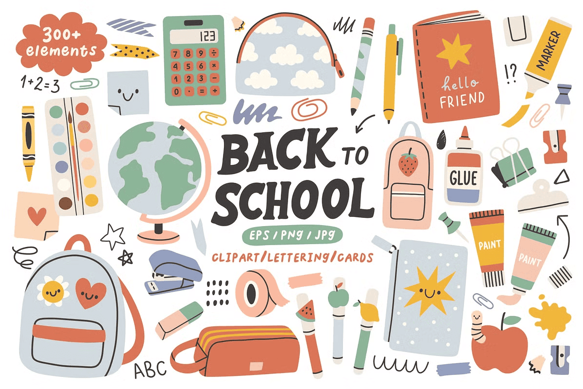 – **281 design elements** – From notebooks and pencils to backpacks and chalkboards, each item is available in **EPS (vector), JPG, and transparent PNG formats** for maximum flexibility