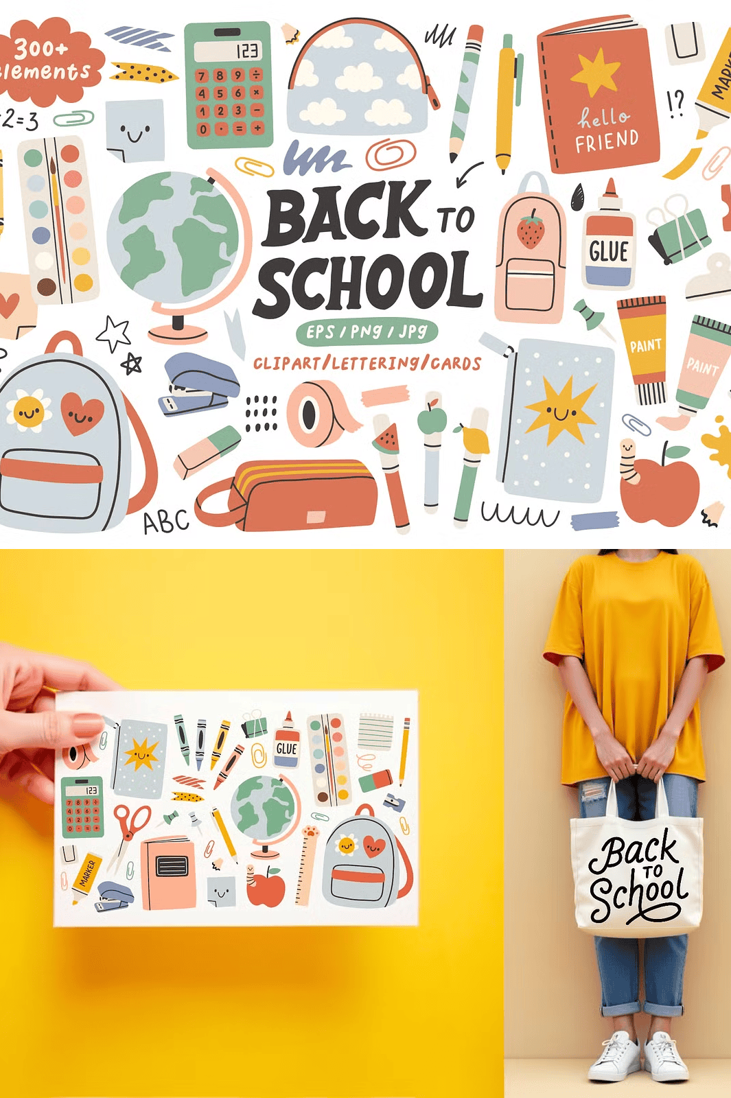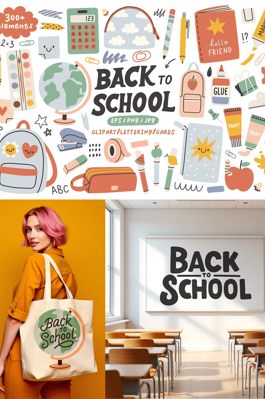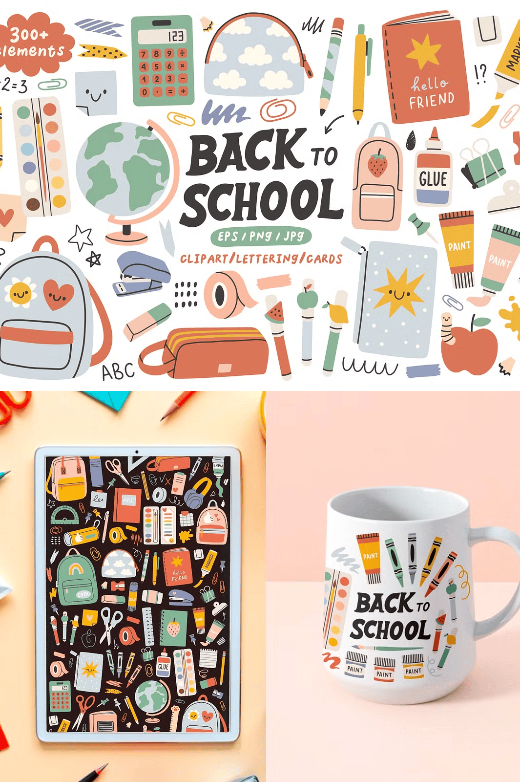 – **281 design elements** – From notebooks and pencils to backpacks and chalkboards, each item is available in **EPS (vector), JPG, and transparent PNG formats** for maximum flexibility
