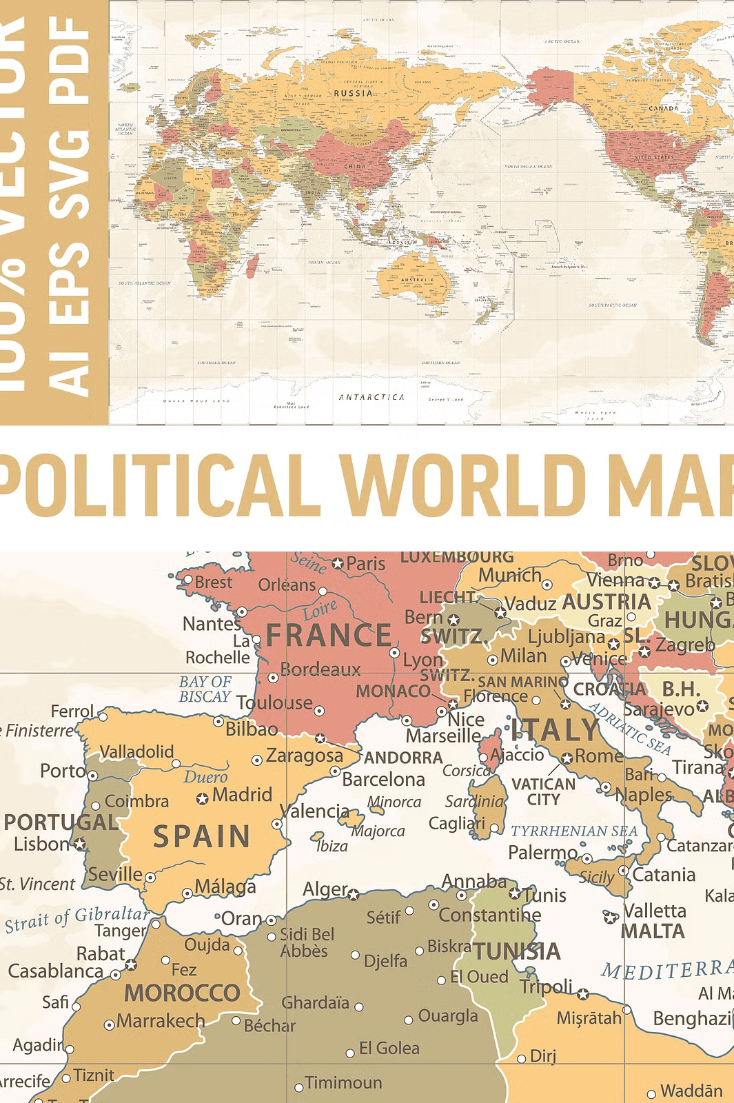 Designed with professional usability in mind, the map offers **separate editable layers** in AI and EPS files, so you can selectively display or hide features like country borders, city markers, rivers, or topographic lines. Customize your visual narrative with ease and efficiency.