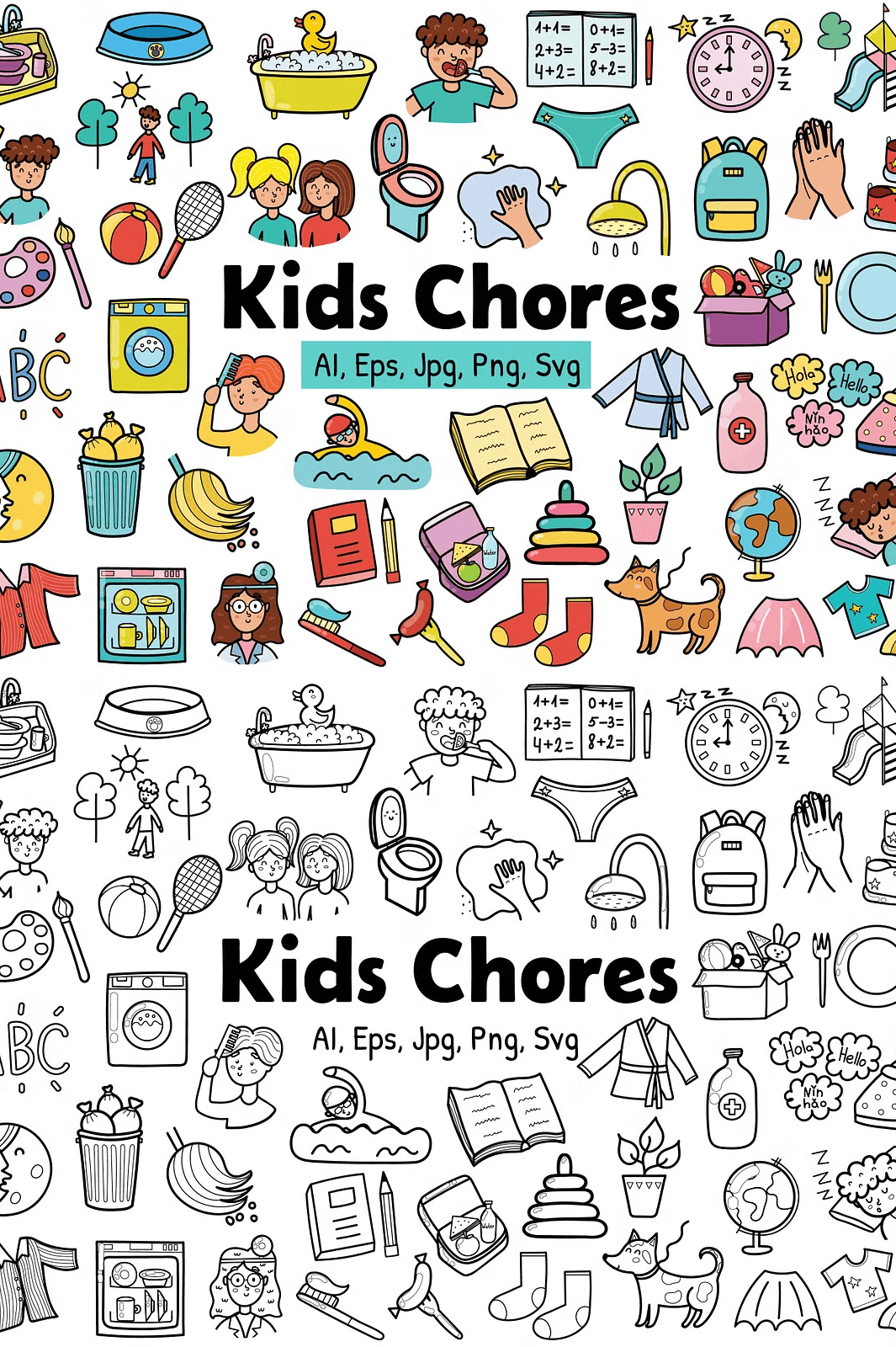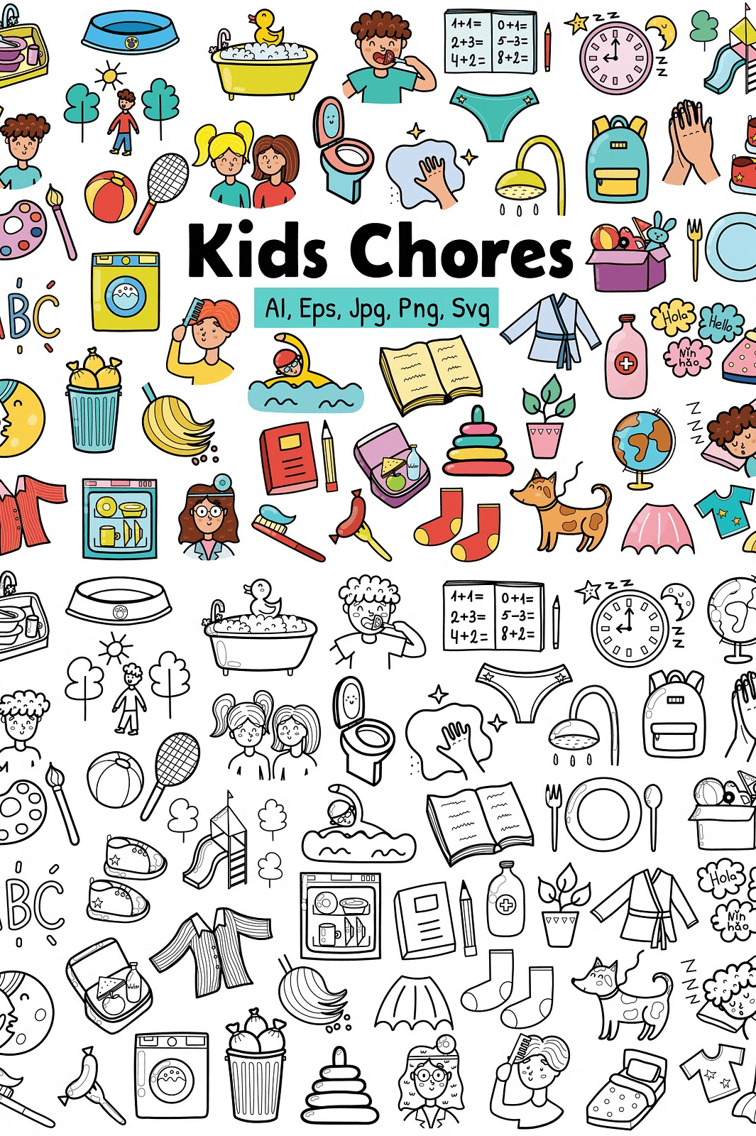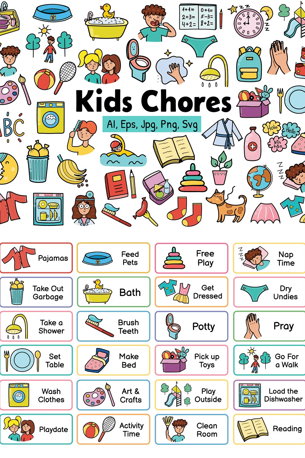 Bring joy and structure to your home or classroom with this cheerful and thoughtfully designed Kids Chores Collection. Featuring **48 vibrant cartoon-style illustrations in full color** and **48 clean black and white line art versions**, this collection turns everyday tasks into engaging, visual experiences that children will actually want to complete.