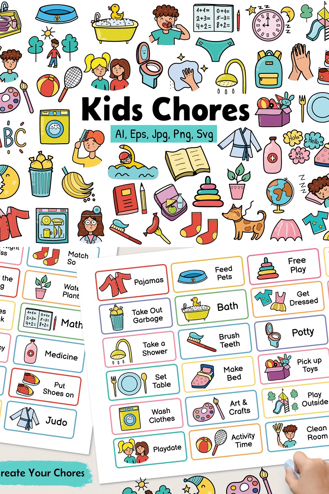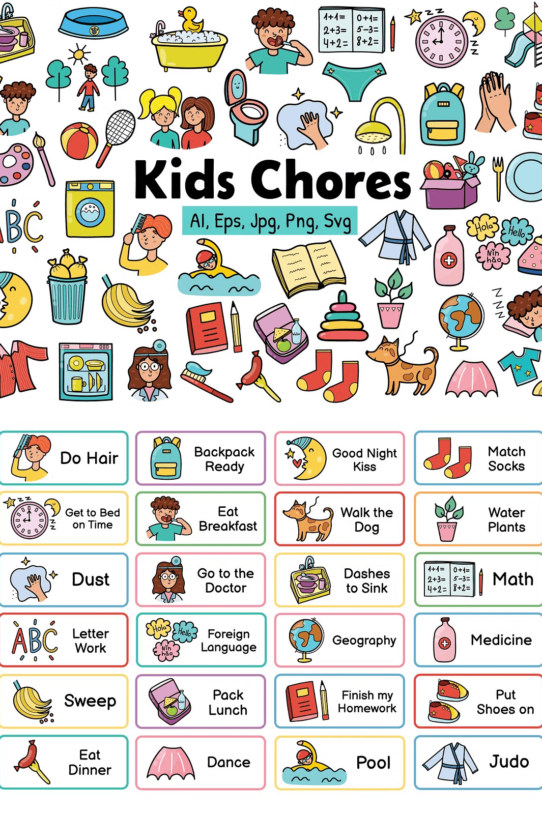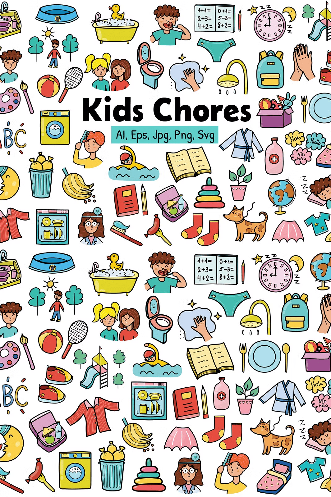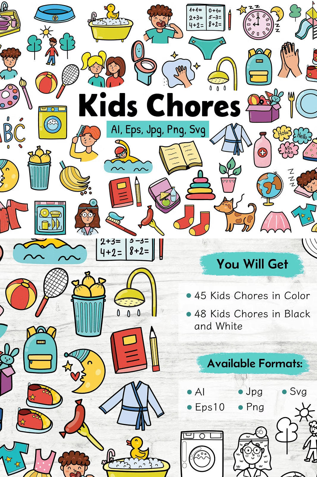 Bring joy and structure to your home or classroom with this cheerful and thoughtfully designed Kids Chores Collection. Featuring **48 vibrant cartoon-style illustrations in full color** and **48 clean black and white line art versions**, this collection turns everyday tasks into engaging, visual experiences that children will actually want to complete.