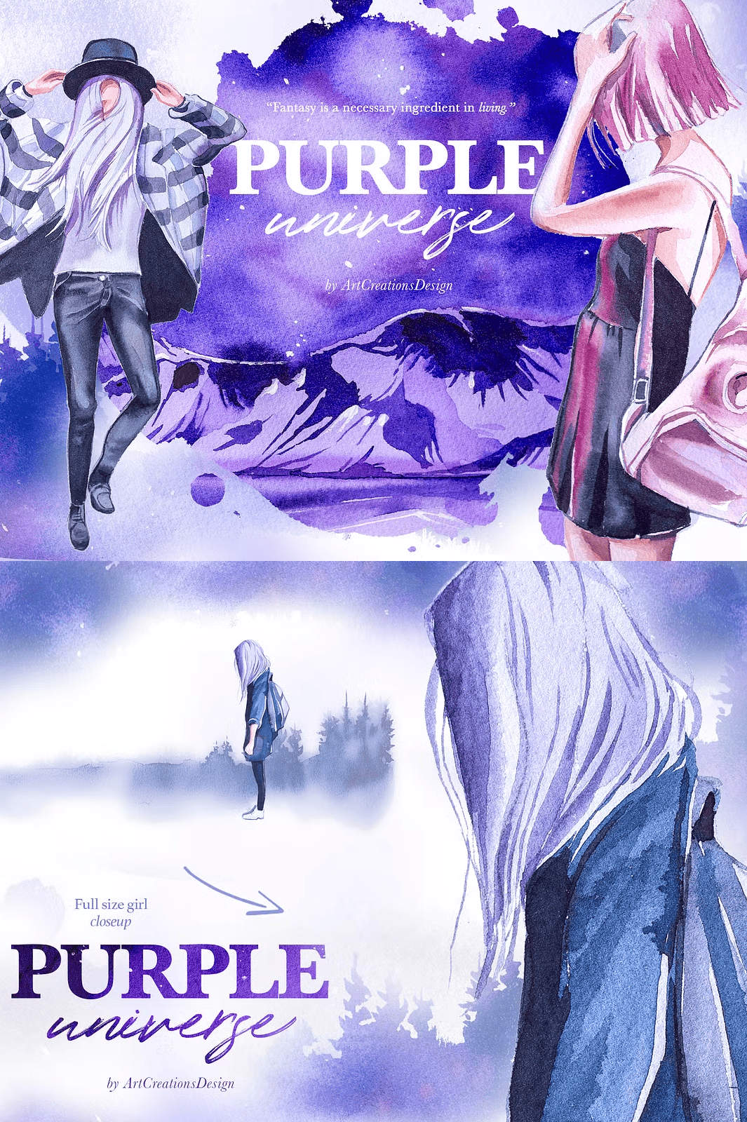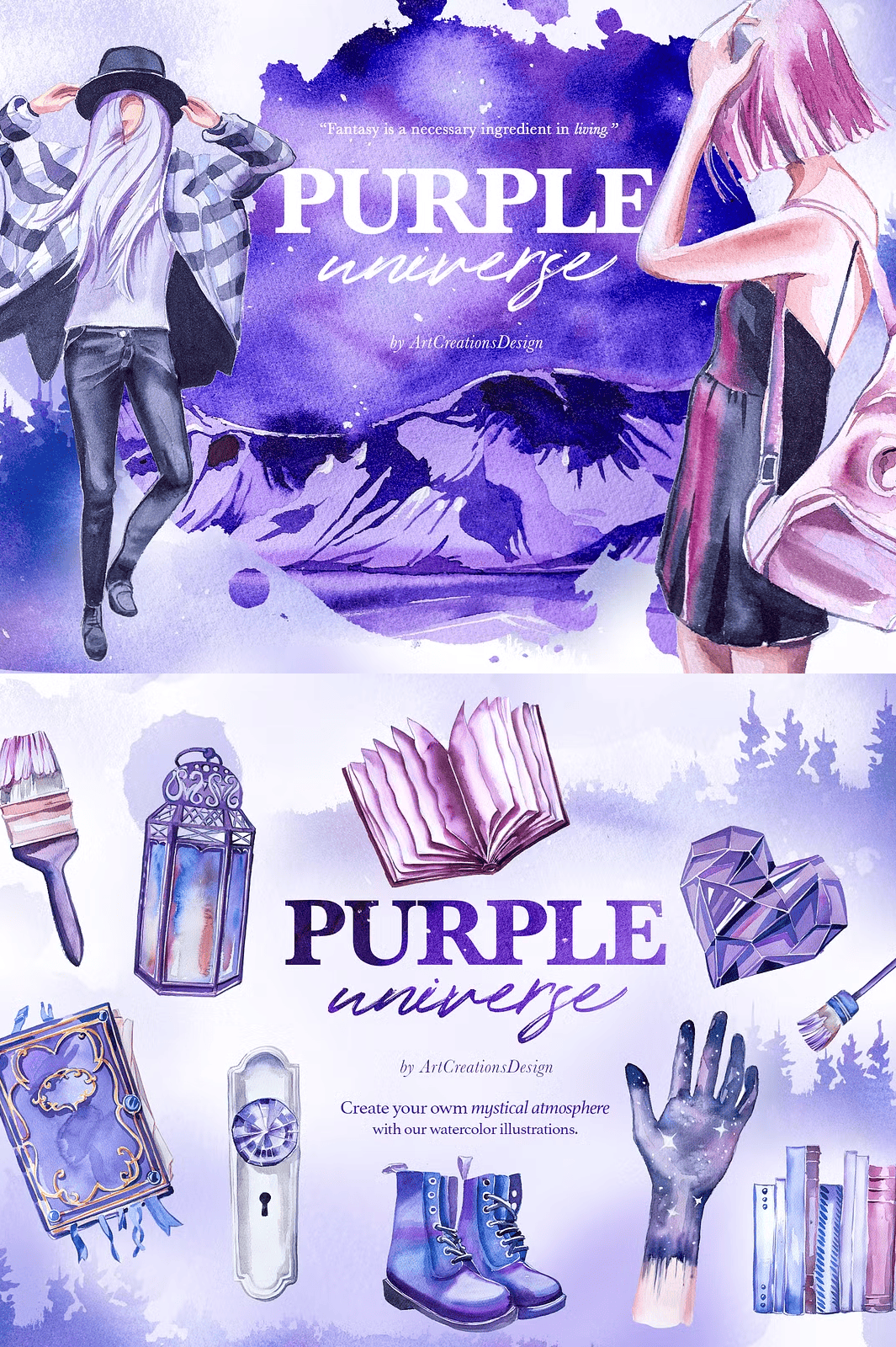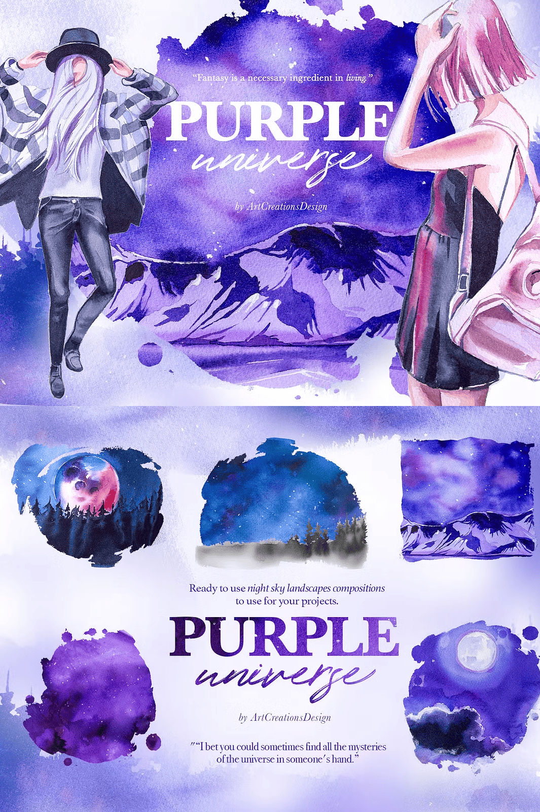 For the strongest visual effect, use the **premade cards, compositions, and scene elements** on a **light or white background** so the vibrant purple watercolor details pop with clarity. Avoid dark backgrounds unless you’re going for a deep cosmic mood. The transparent PNG format allows full flexibility—use them as overlays, shadows, or stand-alone artwork.
