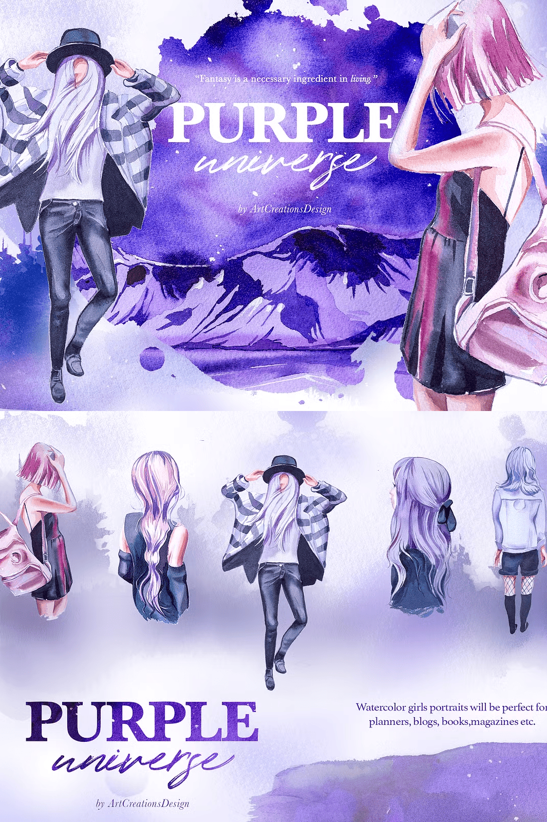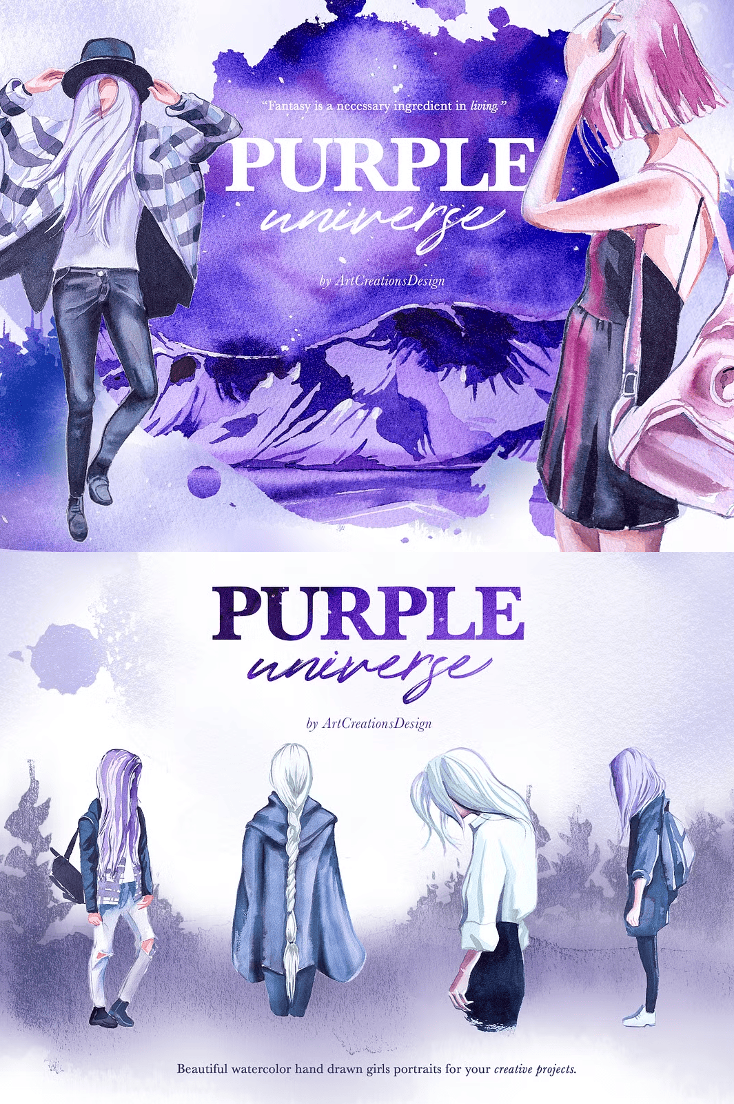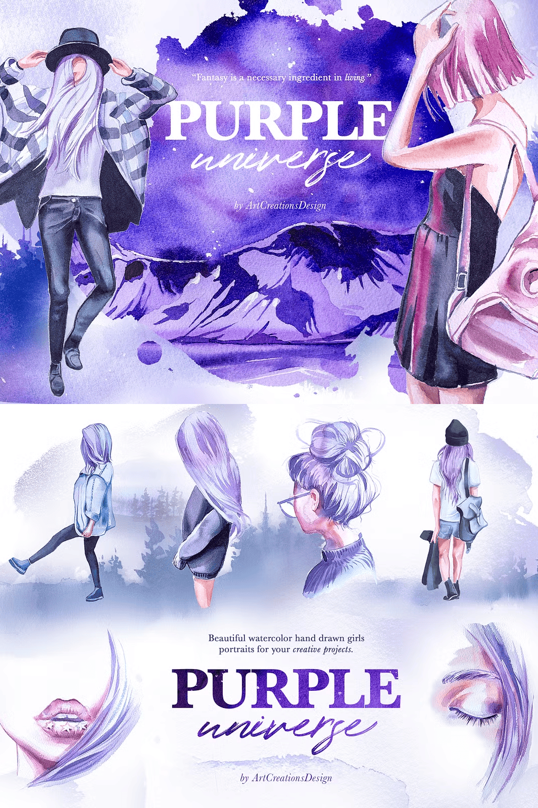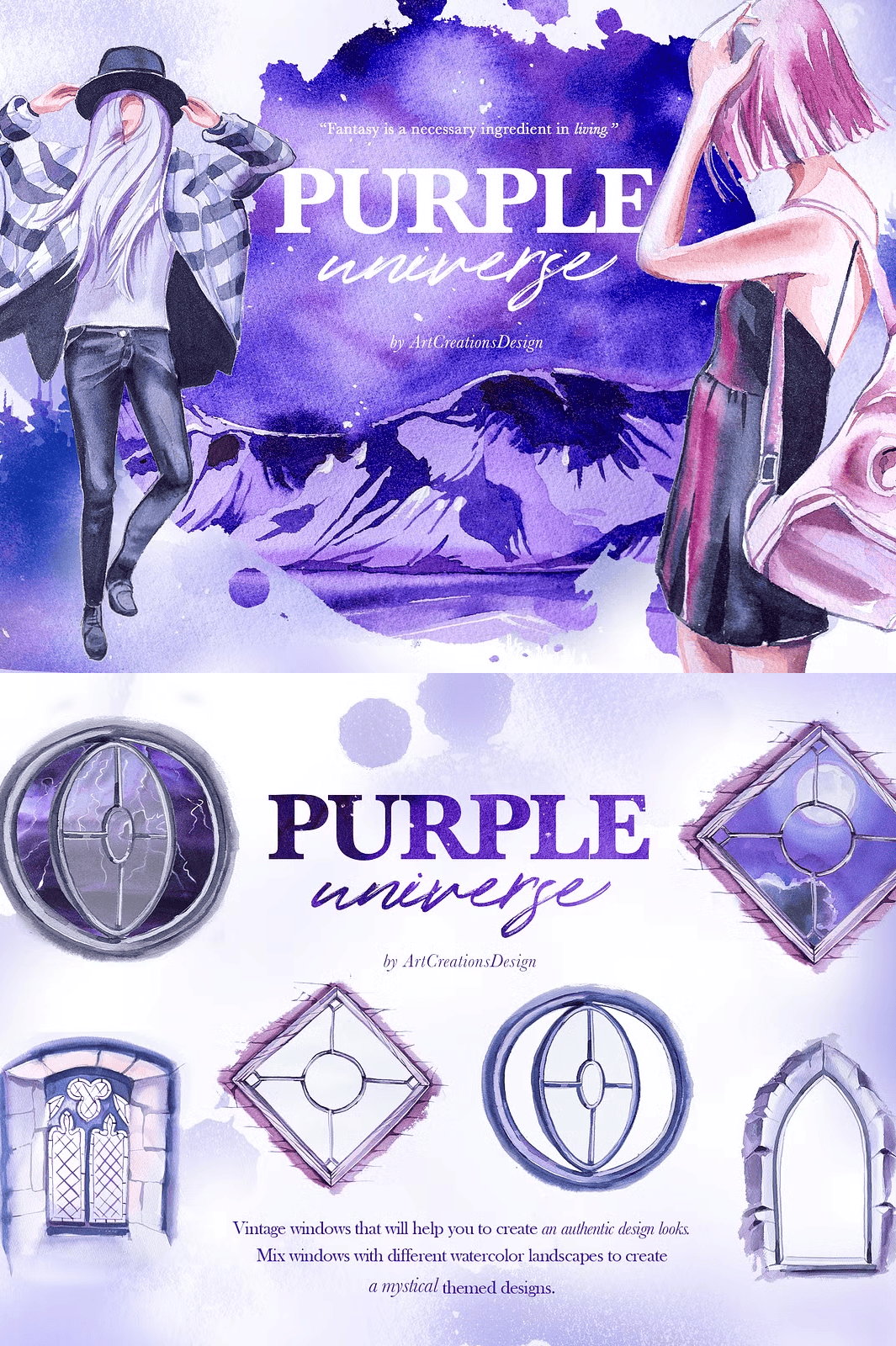 For the strongest visual effect, use the **premade cards, compositions, and scene elements** on a **light or white background** so the vibrant purple watercolor details pop with clarity. Avoid dark backgrounds unless you’re going for a deep cosmic mood. The transparent PNG format allows full flexibility—use them as overlays, shadows, or stand-alone artwork.