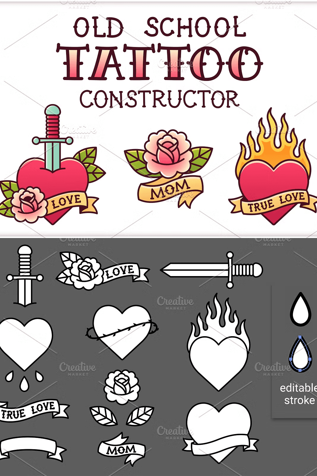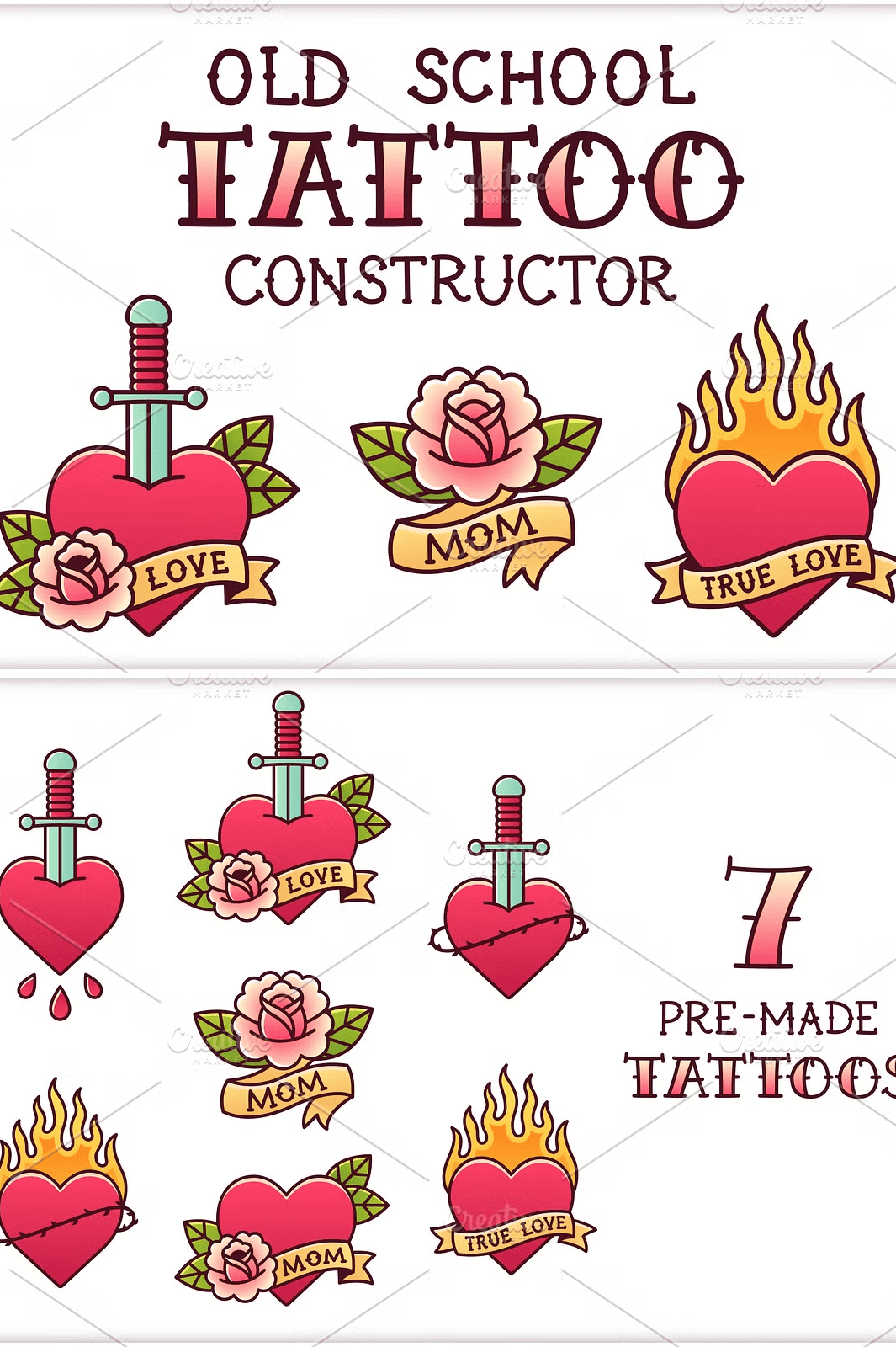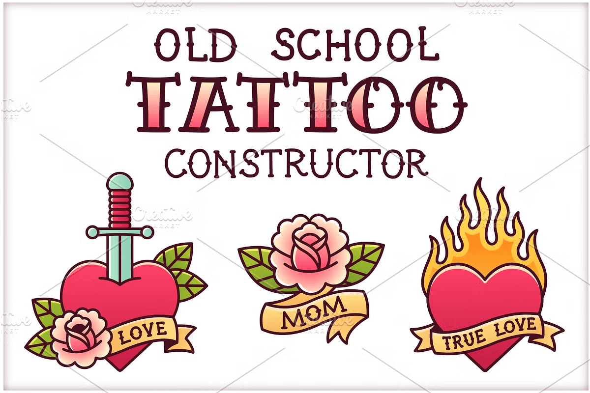 Step into the iconic world of classic American flash tattoos with this powerful, professionally crafted **Vector Tattoo Set** where vintage rebellious spirit meets modern digital precision. Designed for artists, designers, and creative entrepreneurs, this collection delivers a complete arsenal of enduring symbols: **hearts**, **flames**, **daggers**, **rose motifs**, and **scroll text** all rooted in the golden era of old school tattooing.